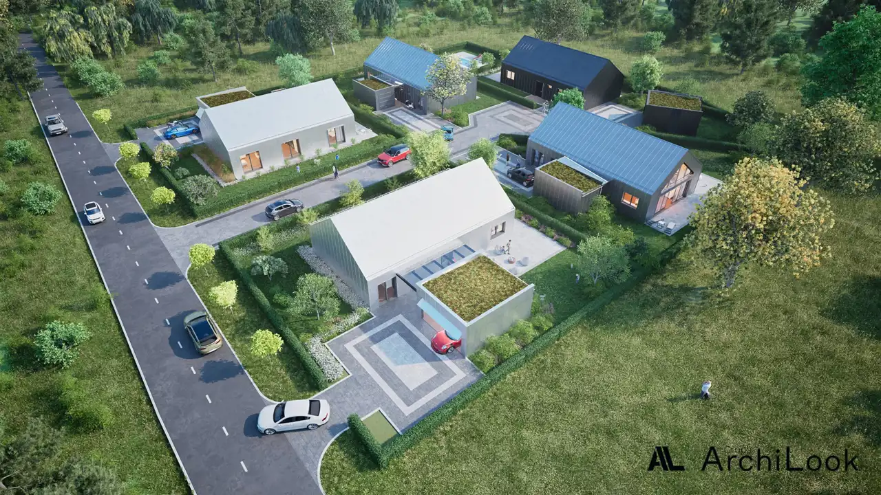 Przestrzeń wokół domów zostanie estetycznie zagospodarowana – z zadbaną zielenią, trawnikami, nasadzeniami oraz nowoczesnym, energooszczędnym oświetleniem, które podkreśli charakter osiedla i zapewni wygodę mieszkańcom.