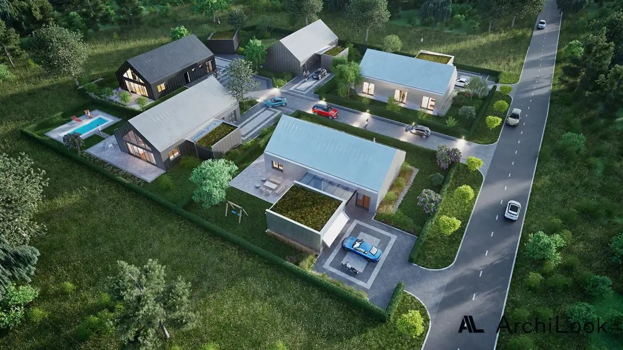 Otoczenie nieruchomości zostanie starannie zagospodarowane – trawniki, nasadzenia i eleganckie, energooszczędne oświetlenie stworzą przyjemny klimat oraz nowoczesny charakter posesji.