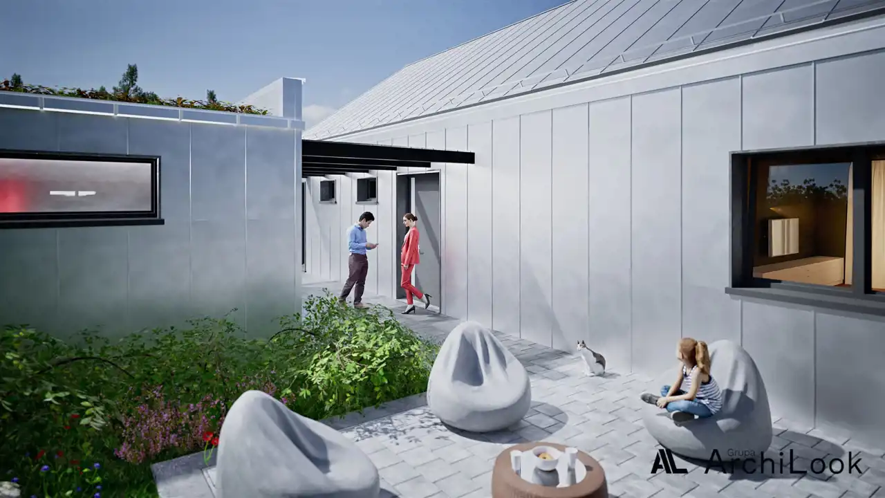 To dom, w którym przestronność, funkcjonalność i nowoczesny design tworzą harmonijną całość. Parterowy układ zapewnia komfort codziennego życia, a przestronny salon z aneksem kuchennym stanowi serce domu, idealne na spotkania rodzinne czy przyjęcia z przyjaciółmi. Dodatkowe pomieszczenia, takie jak spiżarnia, garderoba i kotłownia, zapewniają porządek i wygodę, sprawiając, że każda rzecz ma swoje miejsce.