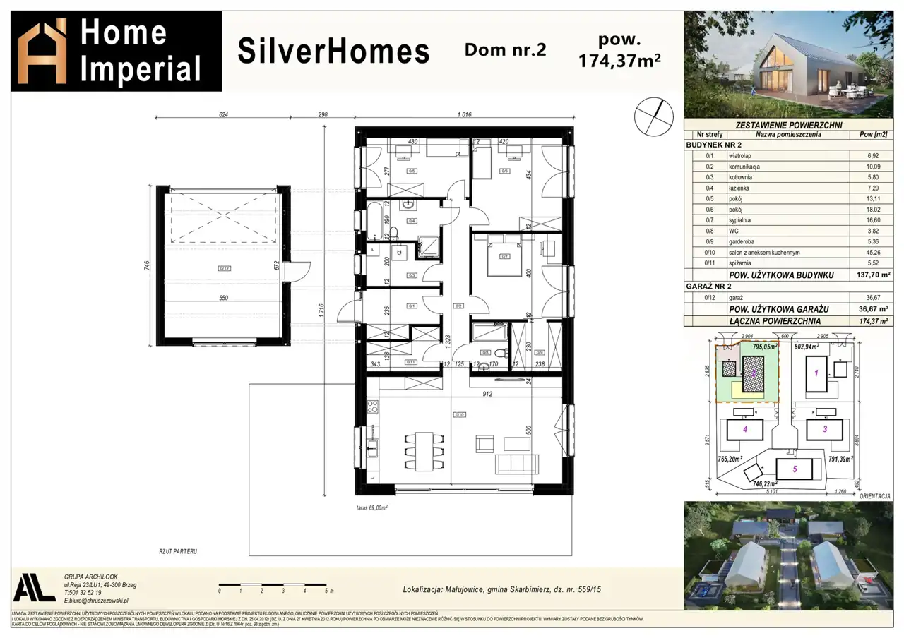 Układ pomieszczeń (pow. użytkowa 137,70 m² + garaż 36,67 m²)