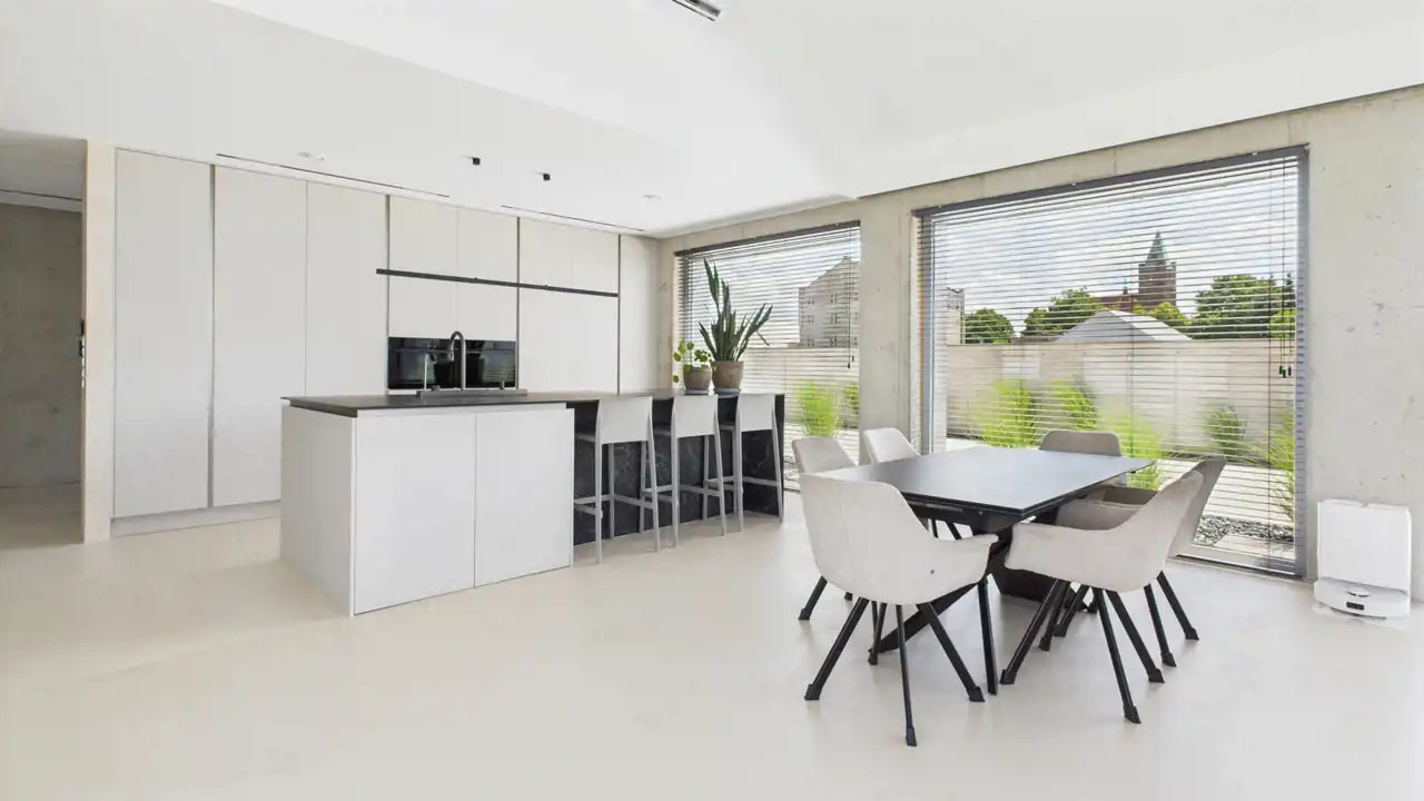 Centralnym punktem jest imponujący salon z kuchnią o powierzchni 80 m² i wysokości nawet do 5 metrów – miejsce, w którym przestrzeń i światło grają główną rolę.