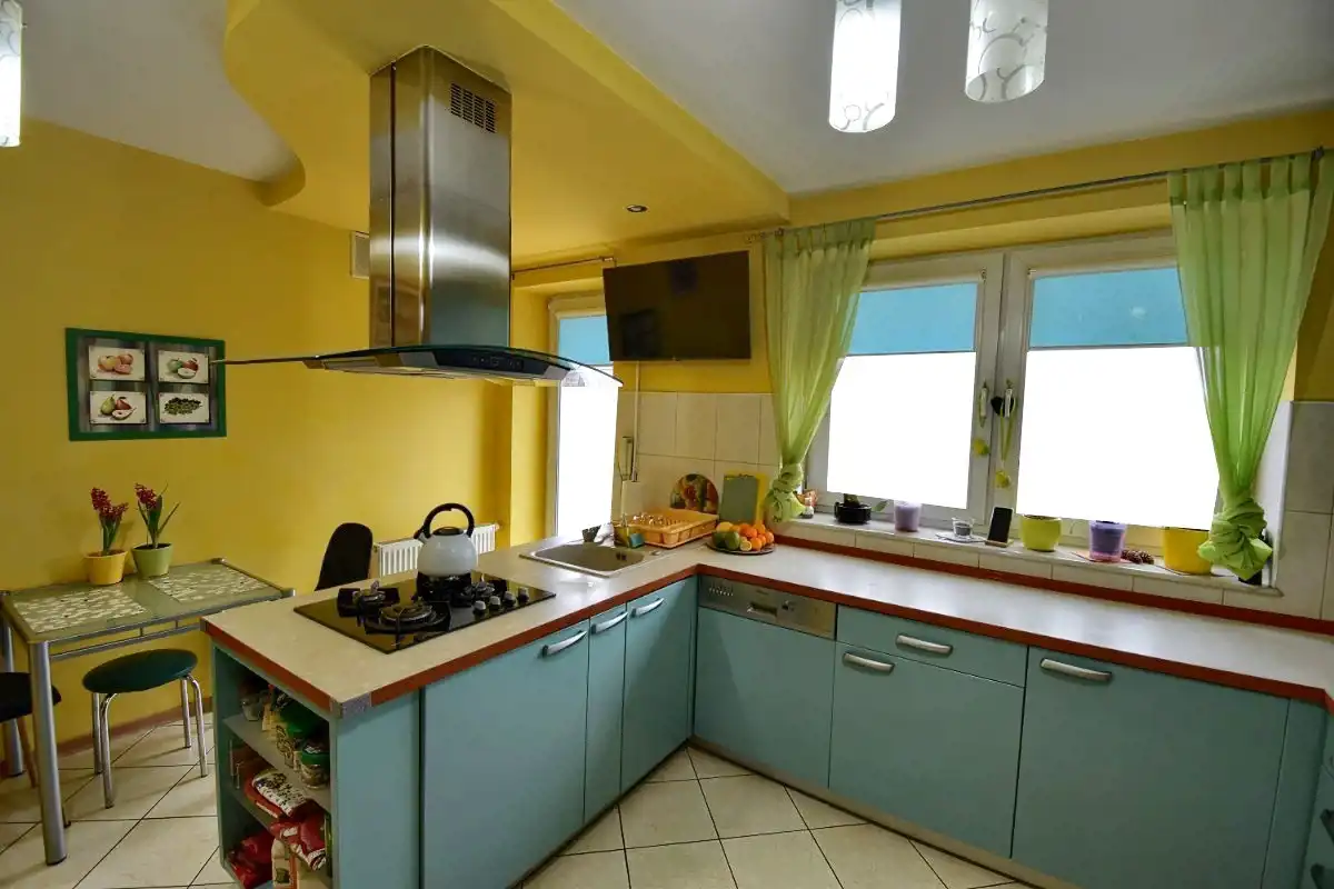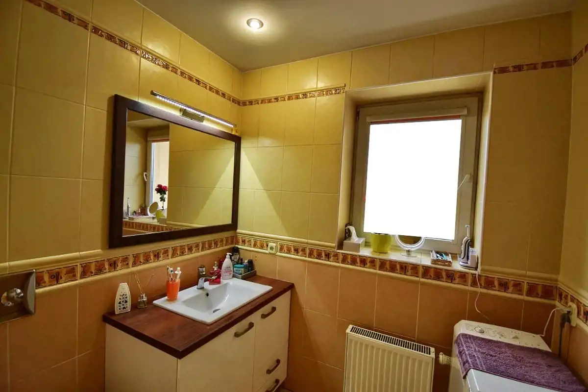 The house was built between 2000 and 2003 using traditional masonry technology with H+H blocks and insulated with 14 cm thick styrofoam. It features PVC windows and a metal tile roof. The residential section has underfloor heating and radiators. The central heating system is powered by a dual-function gas furnace.