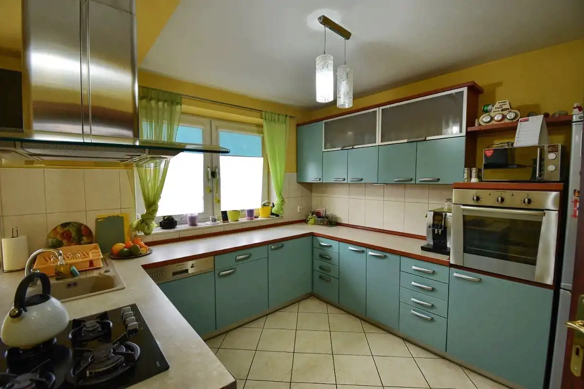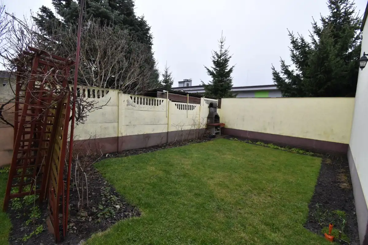 The property is situated on a 471 m² plot. There is also an outbuilding on the premises containing a double garage and a space that can be used as a summer kitchen (utilities are already installed inside the building). The entire area is fenced, with an automatically controlled entrance gate and garage doors.