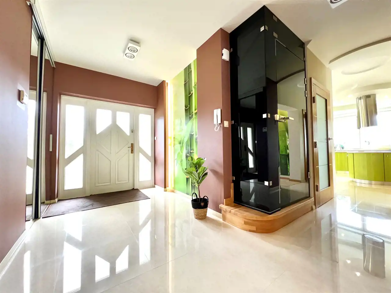 Do budowy domu zostały użyte materiały wysokiej klasy tak jak lite dawno - jesion, kamienie naturalne typu granit czy też marmur, przydymione, hartowane szkło oraz wysokiej jakości sprzęt AGD.