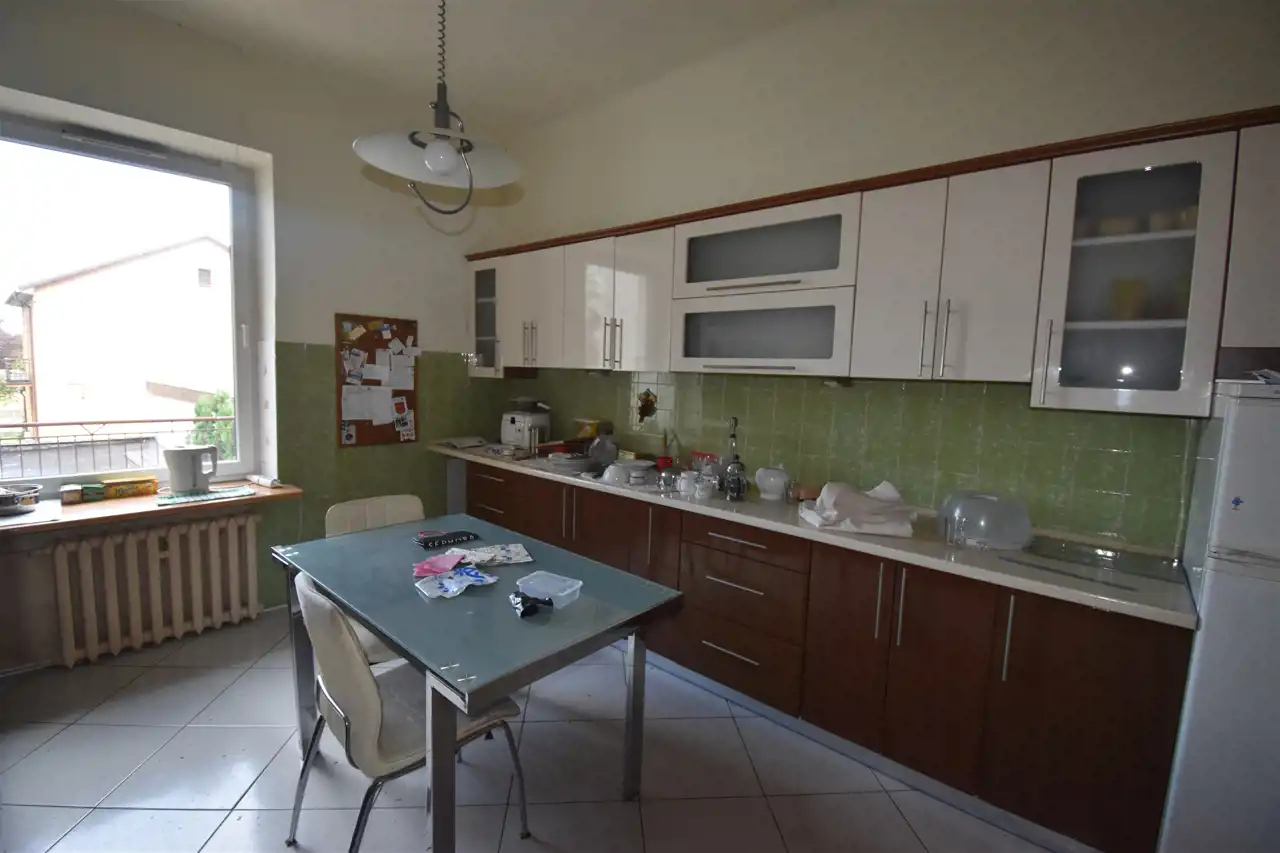na 1 piętrze znajduje się mieszkanie o pow. ok. 130 m2, złożone z salonu połączonego z jadalnią, dwóch sypialni, kuchni oraz łazienki, WC, przedpokoju (istnieje możliwość wyodrębnienia dwóch niezależnych mieszkań)