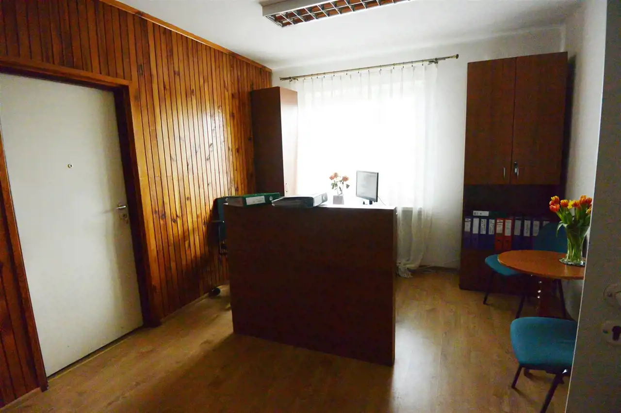 Budynek biurowo - magazynowy (pow. 565,62m2) o trzech kondygnacjach (jednej podziemnej i dwóch nadziemnych). W piwnicy mieszczą się szatnie i część socjalna dla pracowników produkcyjnych oraz skład opału i 2 kotłownie centralnego ogrzewania (w jednej mieszczą się 2 piece gazowe, w drugiej - piec na paliwa stałe). W dwóch kondygnacjach naziemnych znajdują się: sala konferencyjna, pomieszczenia biurowe oraz sanitarne.