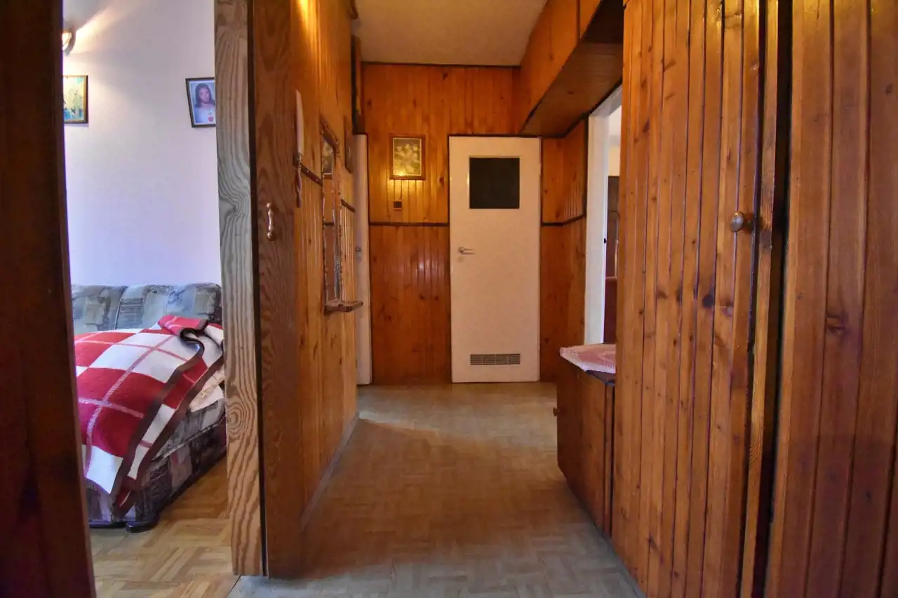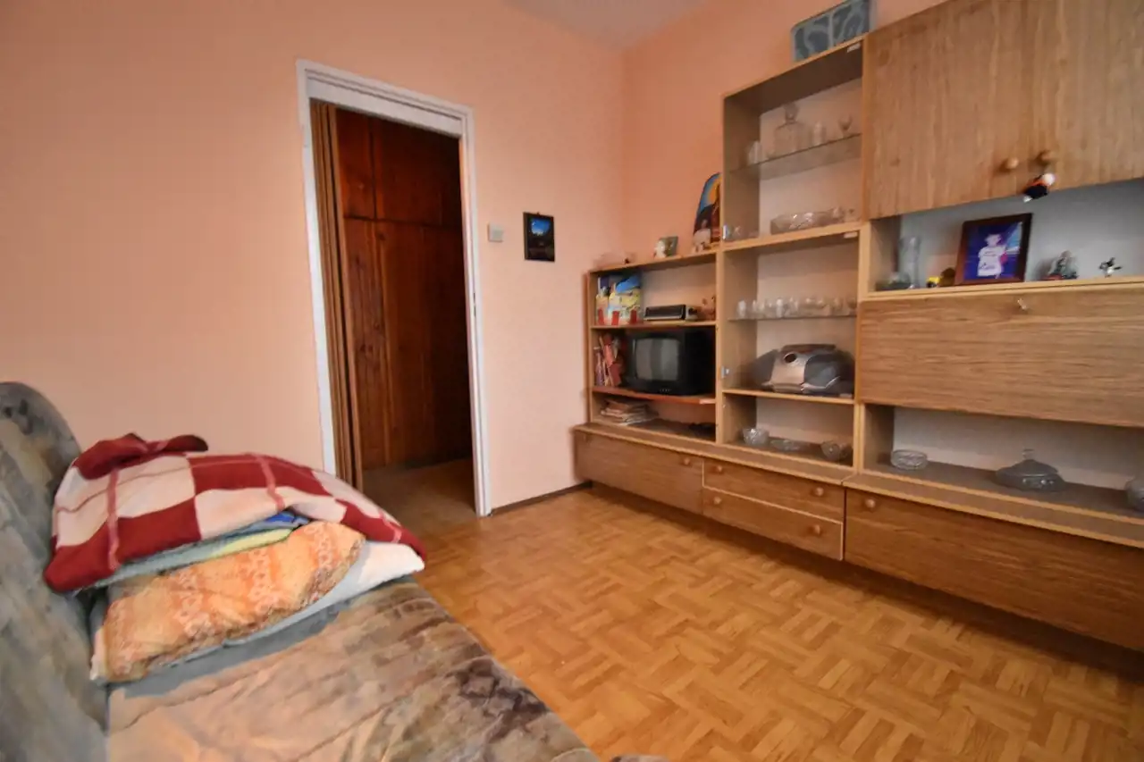 The apartment has PVC windows and linoleum flooring throughout. It is dual-aspect (north-south), quiet, warm, and bright.