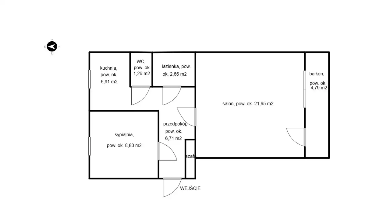 - salon (pow. ok. 21,95 m2) z wyjściem na balkon (pow. ok. 4,79 m2),