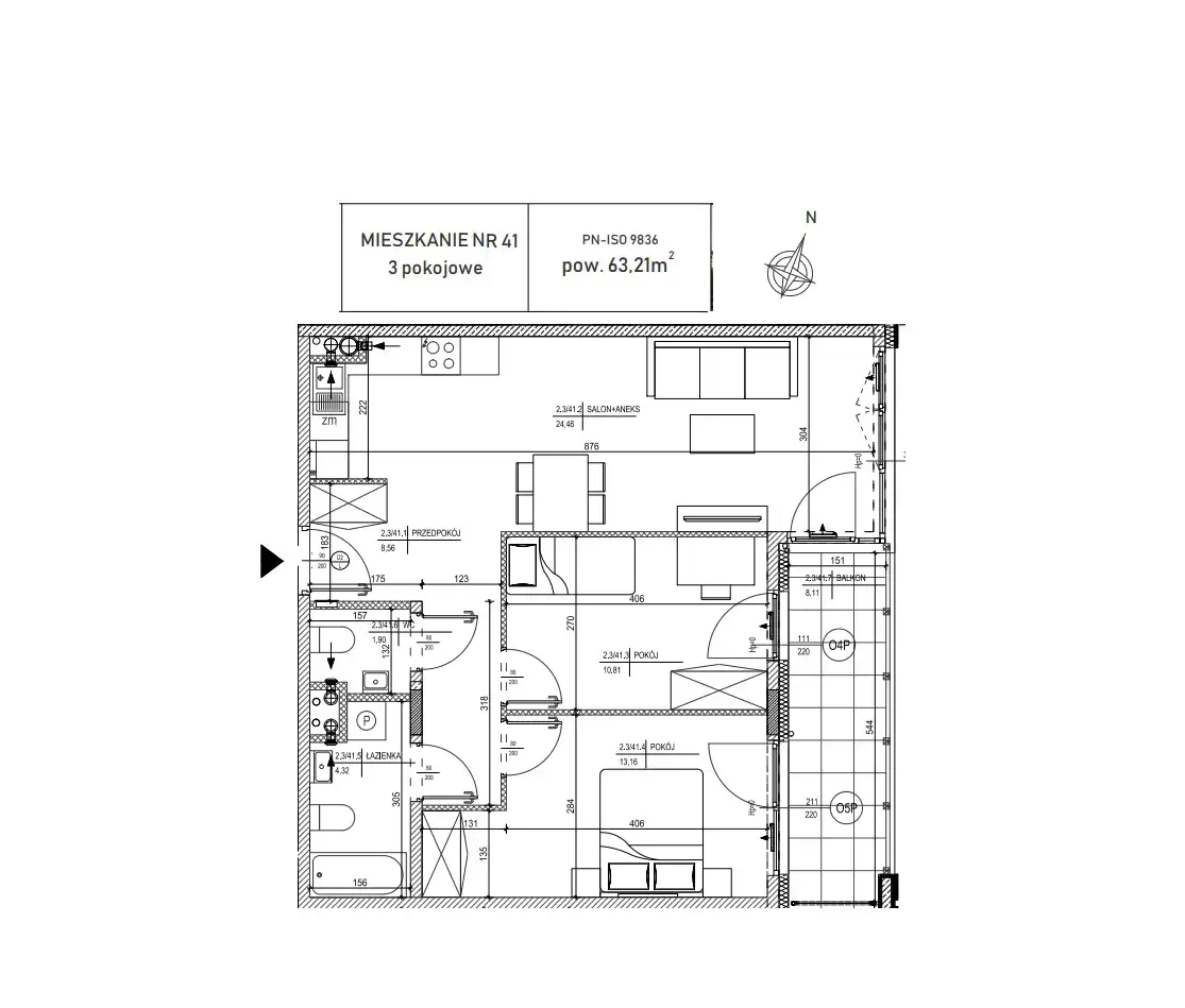 - pokoje: 10,81 m2, 13,16 m2,