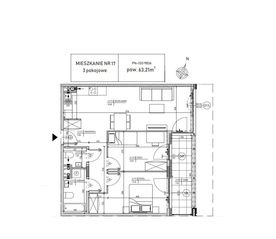 - pokoje: 10,81 m2, 13,16 m2,