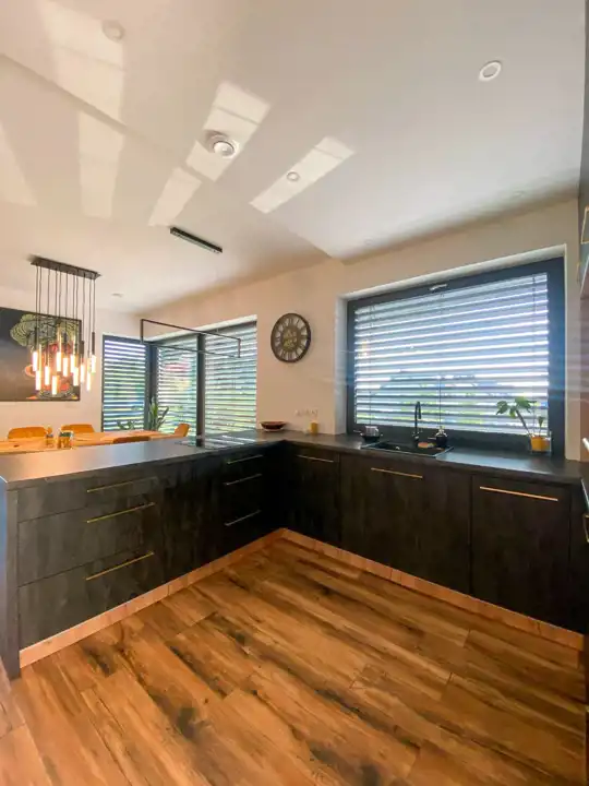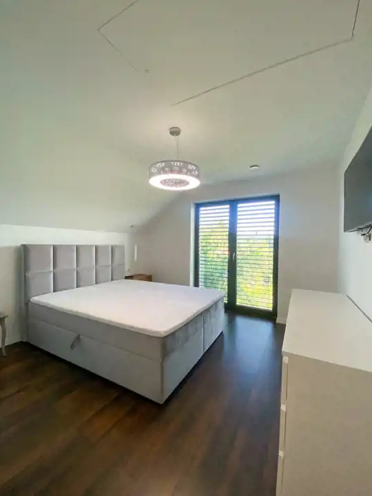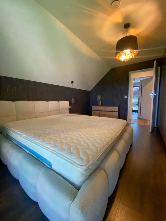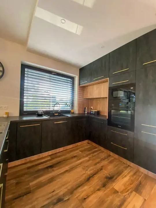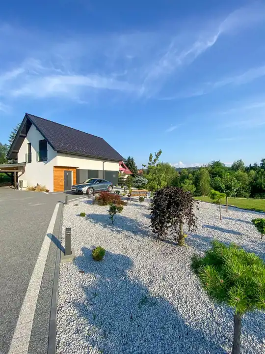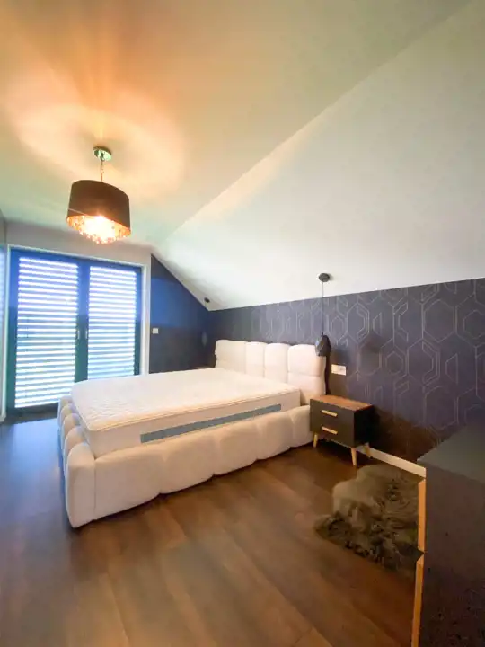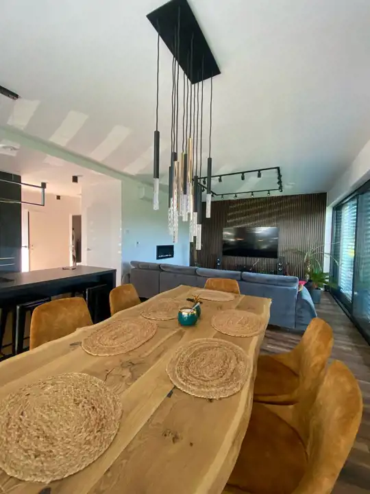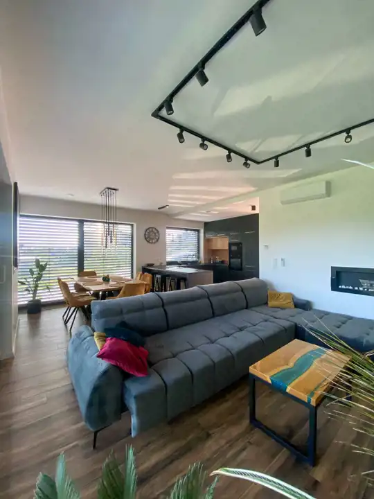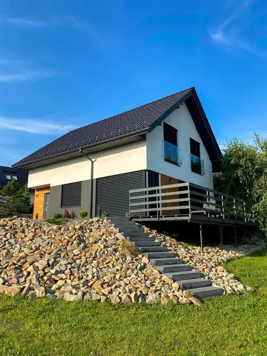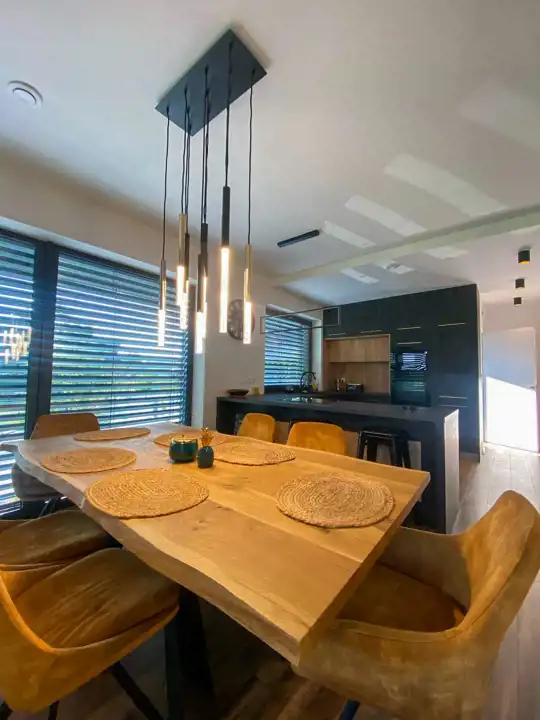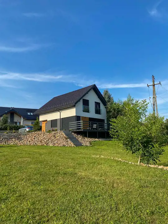 Dom posadowiony na działce ma powierzchnie 105 m2, powstał w 2024 roku i składa się z dwóch kondygnacji. Na parterze znajduje się otwarta kuchnia, salon z dużymi przeszkleniami, toaleta, korytarz oraz kotłownia. Na piętrze są trzy sypialnie oraz duża łazienka z wanną i prysznicem. Dom jest bardzo przytulny, jednocześnie nowoczesny i ponadczasowy. Minimalistyczne oświetlenie, duże przeszklenia, luksusowe meble, eleganckie, drewniane podłogi oraz elementy dekoracyjne nadają mu ekskluzywnego charakteru. Dodatkowymi udogodnieniami są elektryczne rolety zewnętrzne, ogrzewanie podłogowe w całym domu, klimatyzacja oraz rekuperacja. Z salonu na piękny ogród prowadzi duży, drewniany taras.