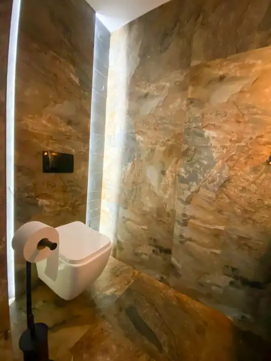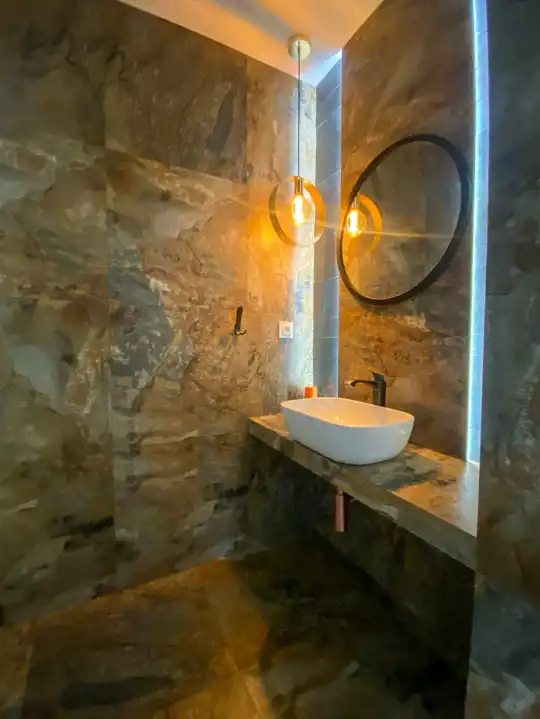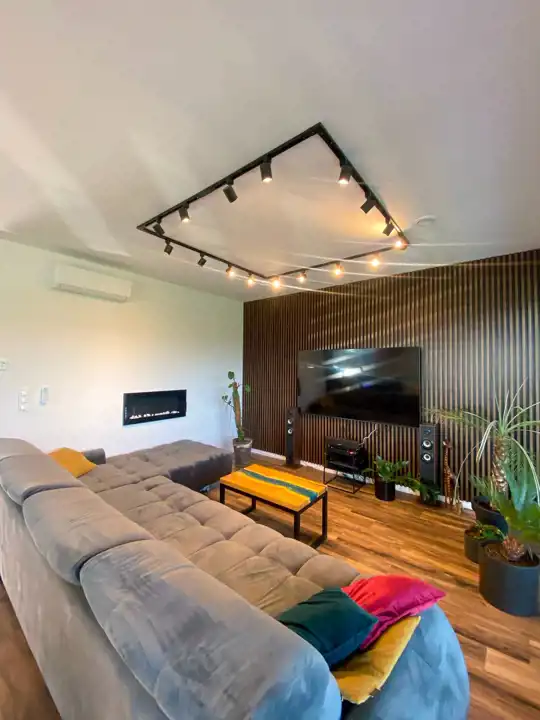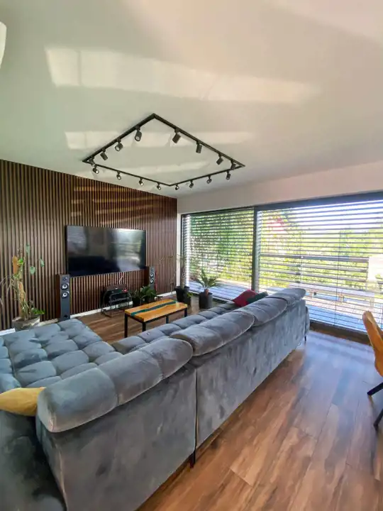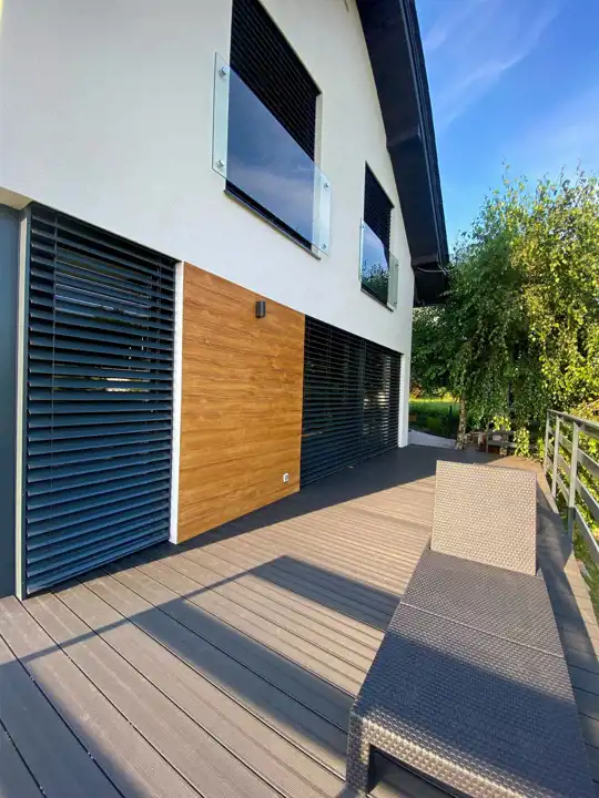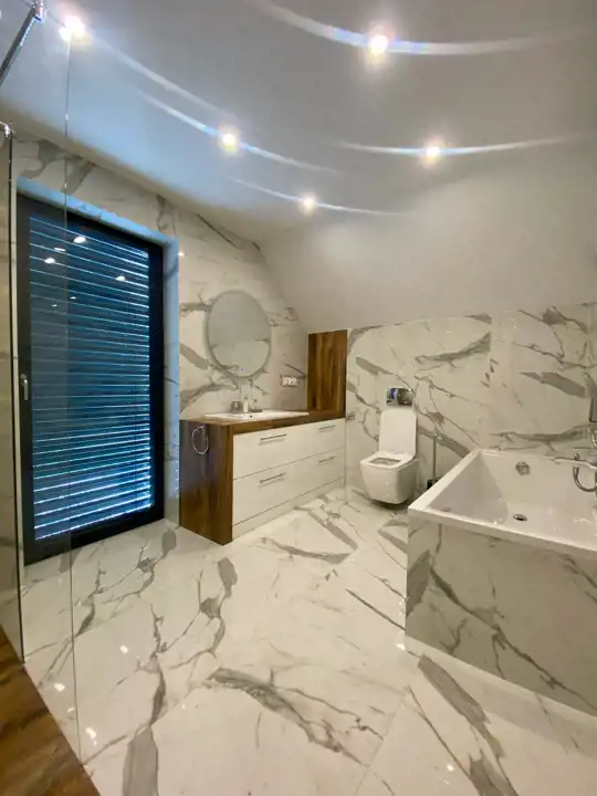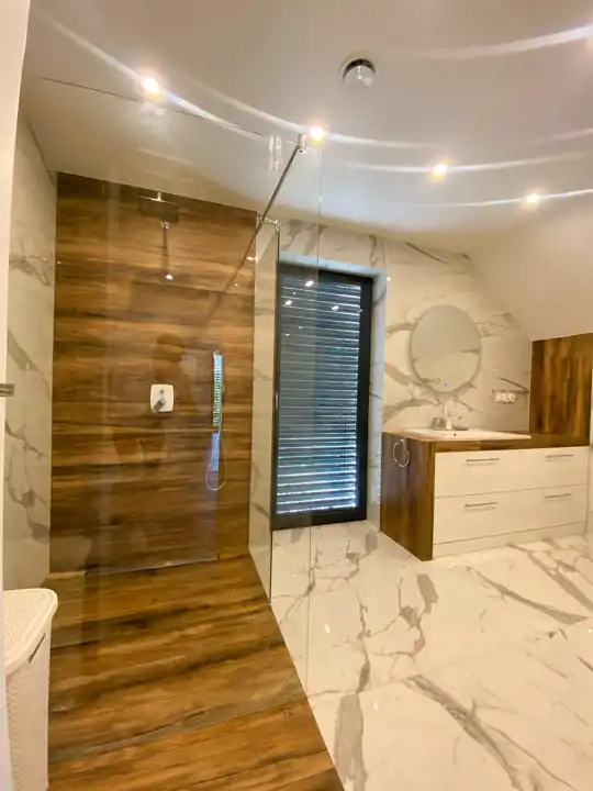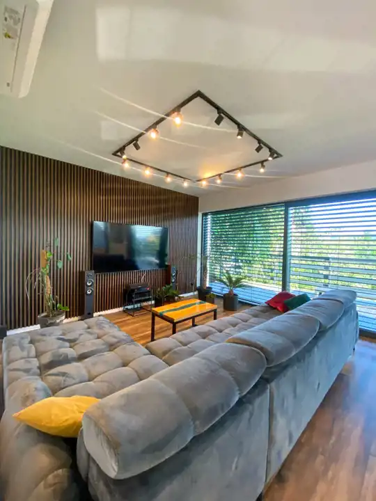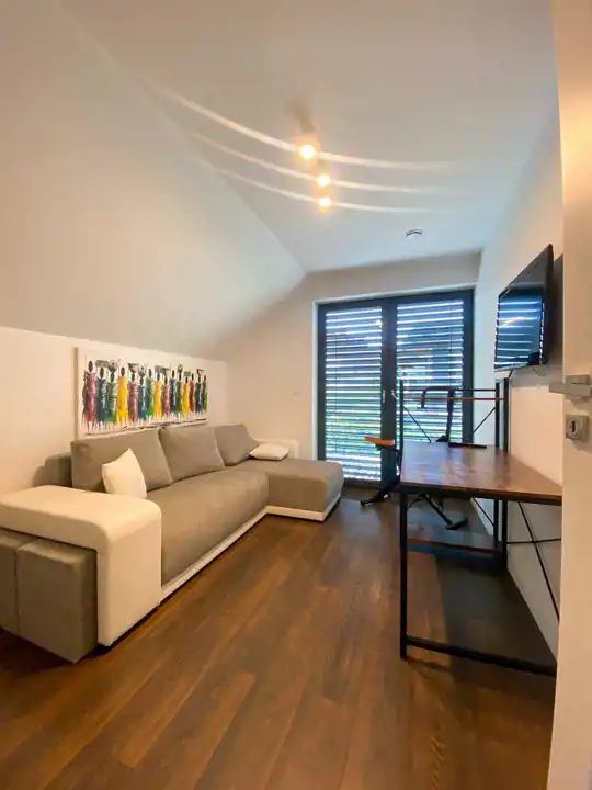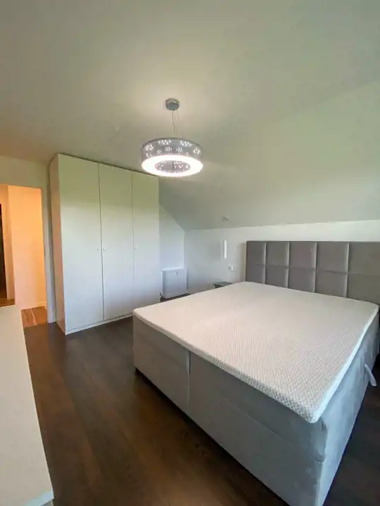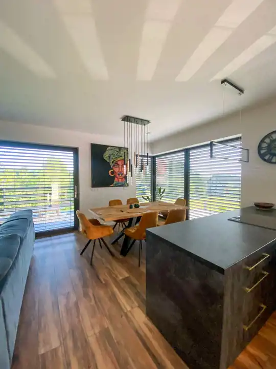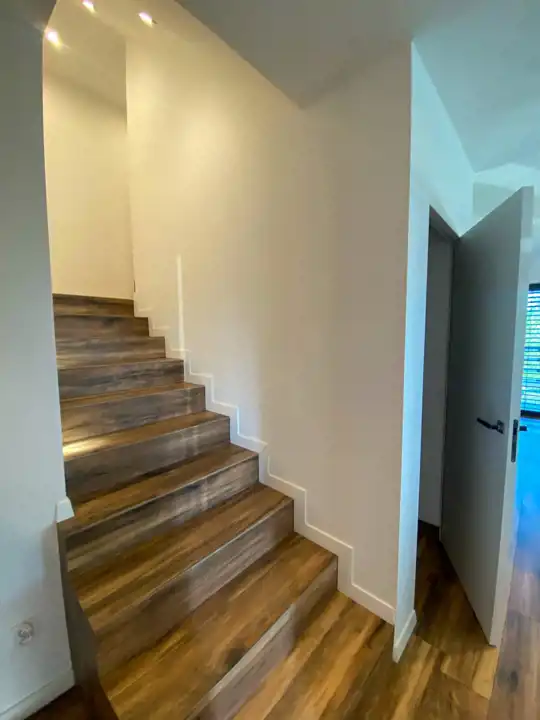 Dom posadowiony na działce ma powierzchnie 105 m2, powstał w 2024 roku i składa się z dwóch kondygnacji. Na parterze znajduje się otwarta kuchnia, salon z dużymi przeszkleniami, toaleta, korytarz oraz kotłownia. Na piętrze są trzy sypialnie oraz duża łazienka z wanną i prysznicem. Dom jest bardzo przytulny, jednocześnie nowoczesny i ponadczasowy. Minimalistyczne oświetlenie, duże przeszklenia, luksusowe meble, eleganckie, drewniane podłogi oraz elementy dekoracyjne nadają mu ekskluzywnego charakteru. Dodatkowymi udogodnieniami są elektryczne rolety zewnętrzne, ogrzewanie podłogowe w całym domu, klimatyzacja oraz rekuperacja. Z salonu na piękny ogród prowadzi duży, drewniany taras.