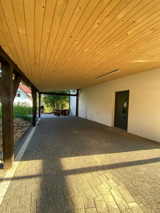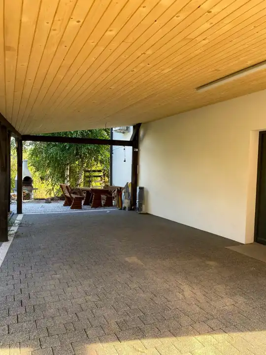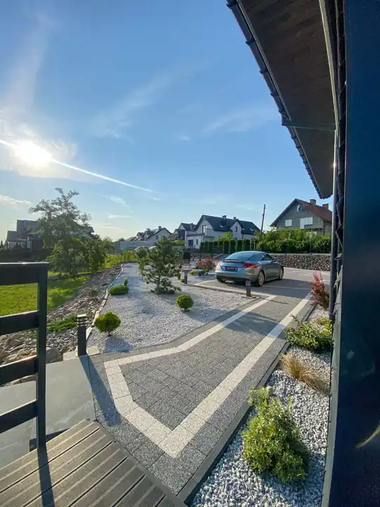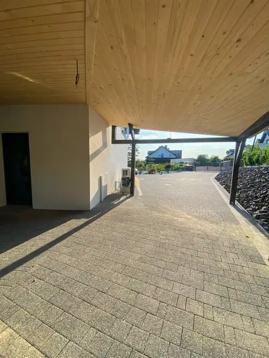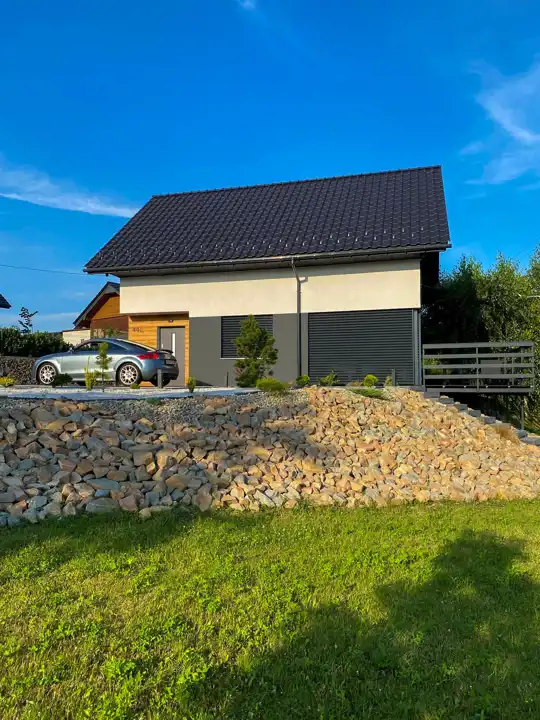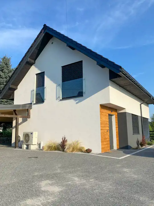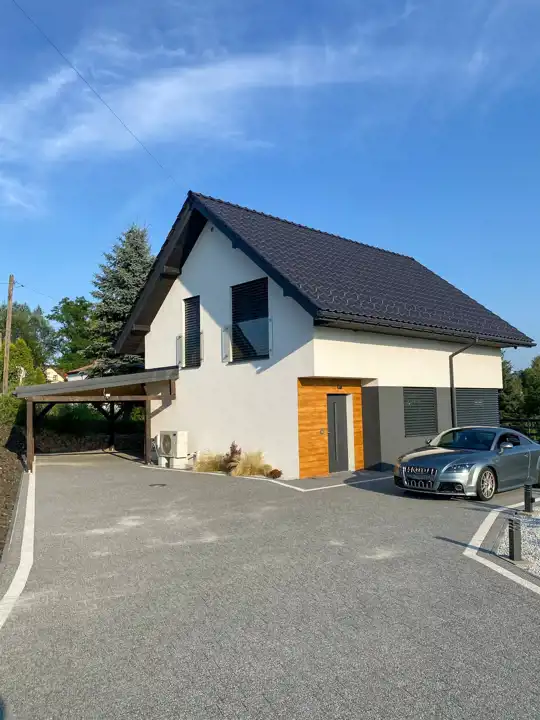 Dom nie posiada zabudowanego garażu. Z boku przylega do niego wiata, z wejściem bocznym do nieruchomości. Ogrzewanie pompą ciepła.