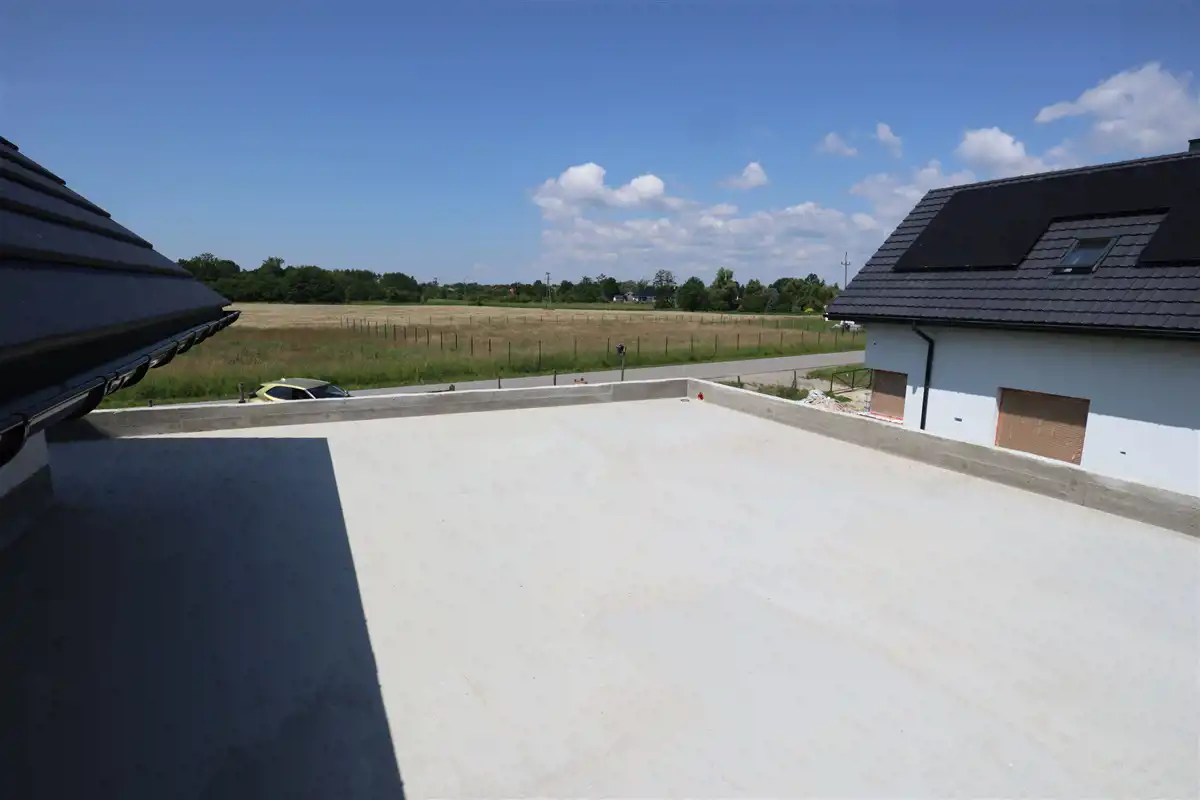 Dom posiada balkon oraz naziemny zadaszony taras.