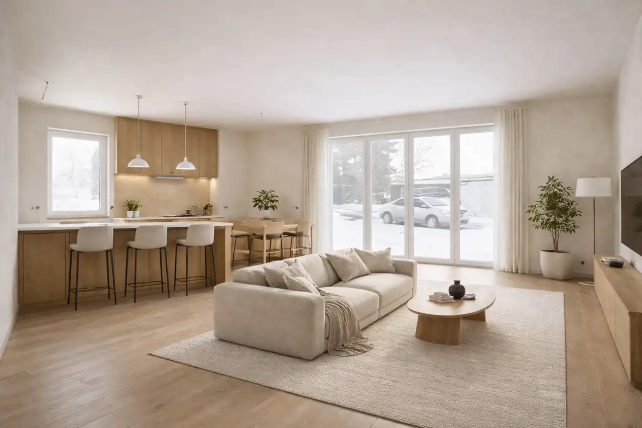 Przestronny pokój dzienny z kuchnią – 30,90 m², jasna i otwarta przestrzeń z miejscem na salon, jadalnię i kuchnię