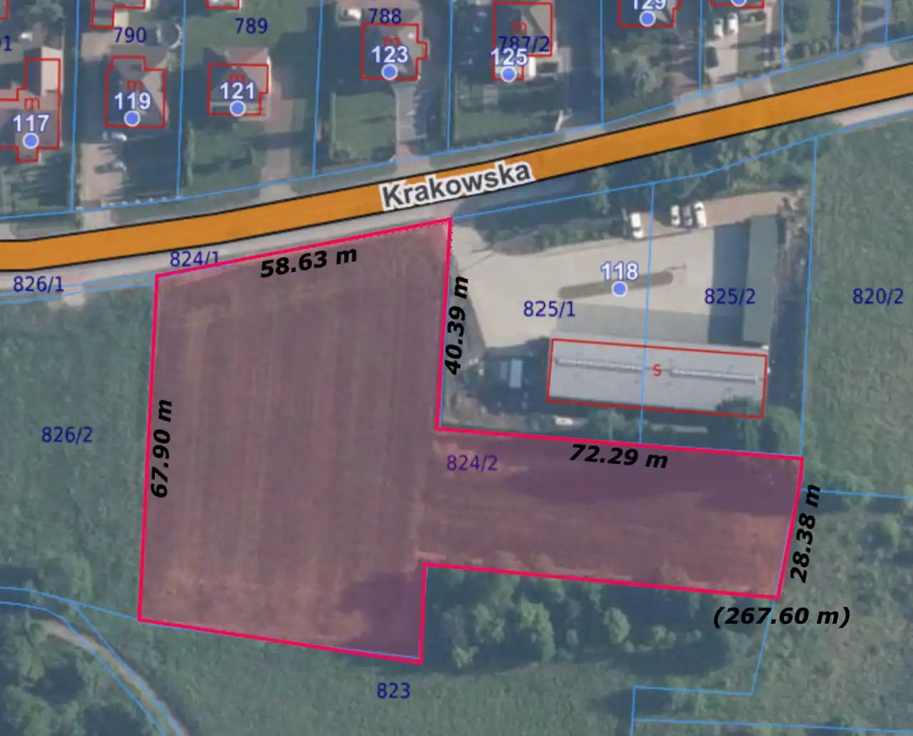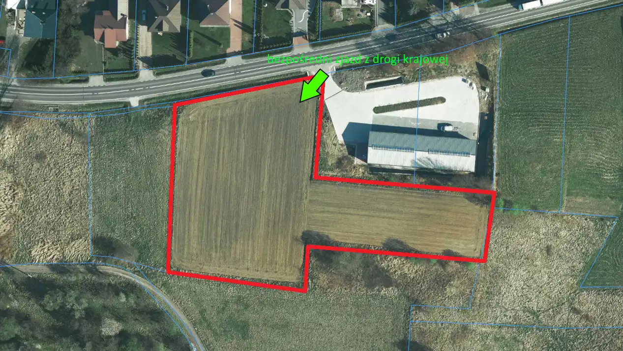 Działka budowlana w Jaśkowicach k/Skawiny gm. Skawina, powiat krakowski. Działka o powierzchni 6200 m2 i wymiarach części głównej 67 x 56 m. Działka posiada bezpośredni dostęp do drogi publicznej. DOJAZD I NAJBLIŻSZA OKOLICA Działka posiada dostęp do drogi krajowej nr 44 z pozwoleniem na obsługę komunikacyjną (bezpośredni zjazd z drogi krajowej). Lokalizacja pozwala jednocześnie na łatwy dostęp do niezbędnych obiektów użyteczności publicznej. Dojazd zajmuje odpowiednio: do Skawiny (11 km), do obwodnicy Krakowa (14 km).