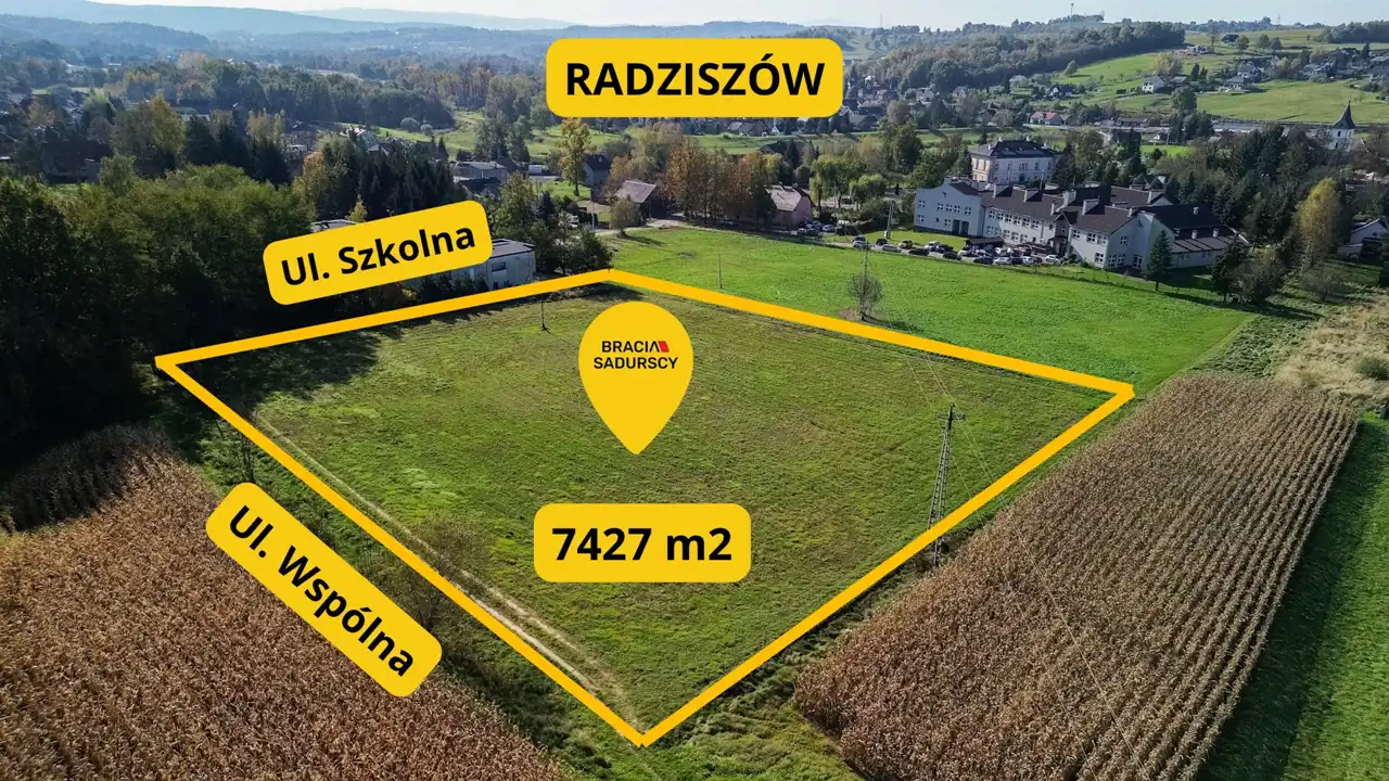 Oferujemy na sprzedaż działkę budowlaną w Radziszowie o powierzchni 7427 m2, w kształcie kwadratu o wymiarach: