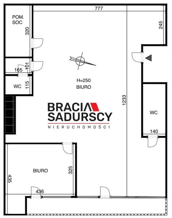 Lokal obecnie w większości typu open space- wydzielony jeden gabinet osobny, pomieszczenie socjalne, 2 x toalety ( istnieje możliwość własnej adaptacji układu lokalu po ustaleniu z właścicielem- duży potencjał i szerokie możliwości aranżacji)