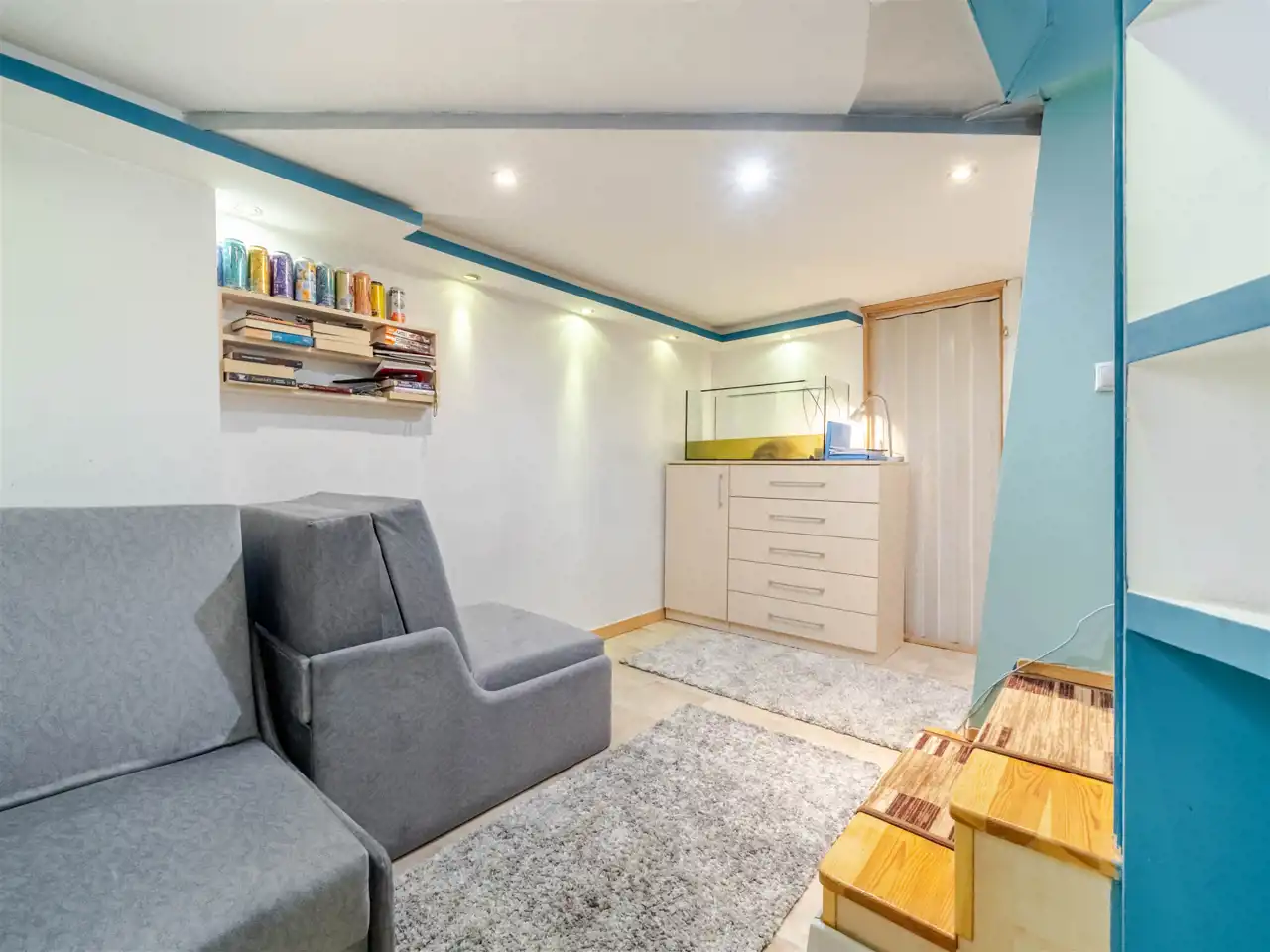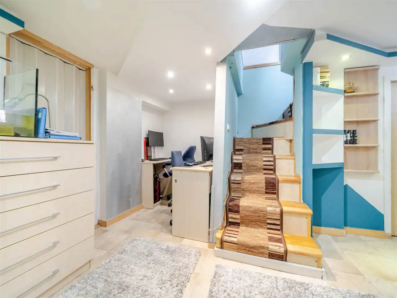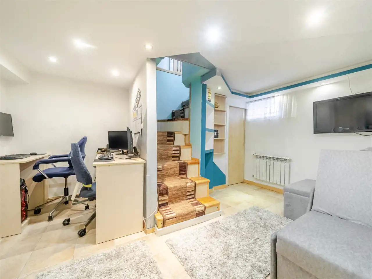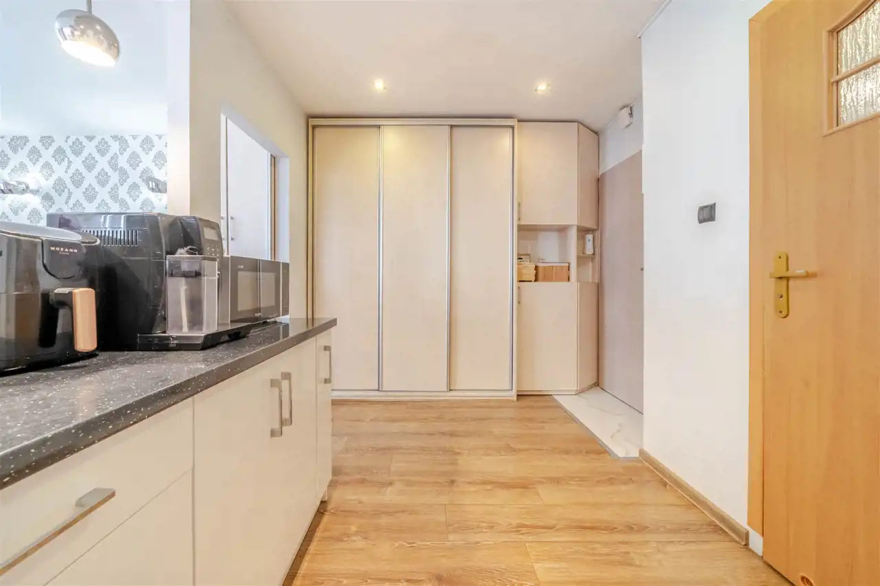 Mieszkanie znajduje się na parterze i jest unikatowe ponieważ położone jest na dwóch poziomach. Na poziomie 0 znajduje się przedpokój, piękny duży salon, aneks kuchenny i sypialnia. Z sypialni schodzi się na poziom -0,5 na którym znajduje się gabinet i pomieszczenie gospodarcze. Doskonałe rozwiązanie dla osób potrzebujących spokoju do pracy podczas gdy na górze toczy się życie towarzyskie lub rodzinne.