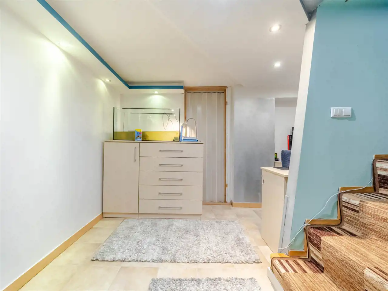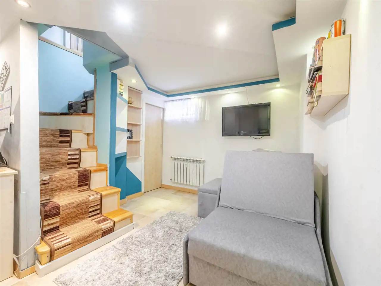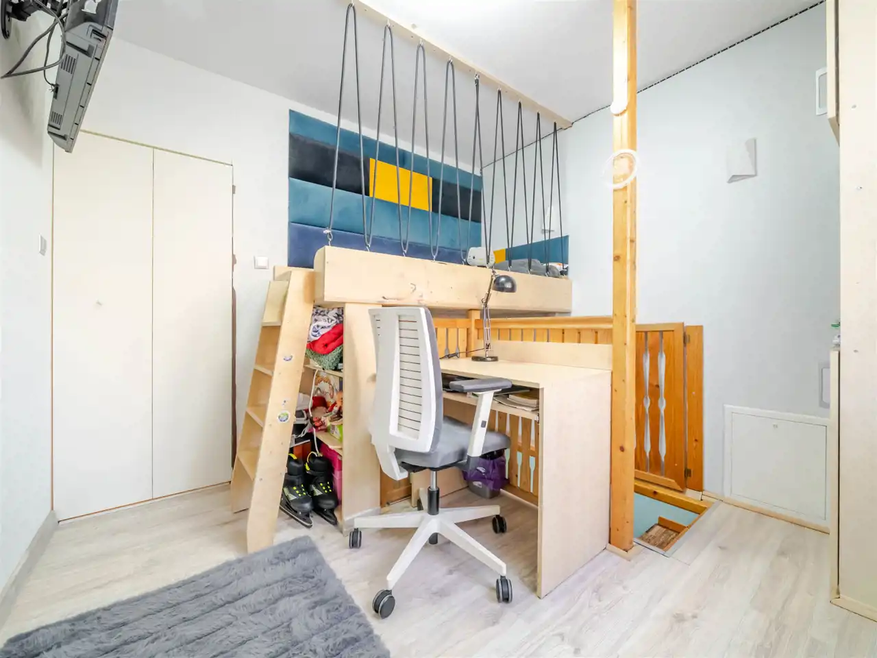 Mieszkanie znajduje się na parterze i jest unikatowe ponieważ położone jest na dwóch poziomach. Na poziomie 0 znajduje się przedpokój, piękny duży salon, aneks kuchenny i sypialnia. Z sypialni schodzi się na poziom -0,5 na którym znajduje się gabinet i pomieszczenie gospodarcze. Doskonałe rozwiązanie dla osób potrzebujących spokoju do pracy podczas gdy na górze toczy się życie towarzyskie lub rodzinne.