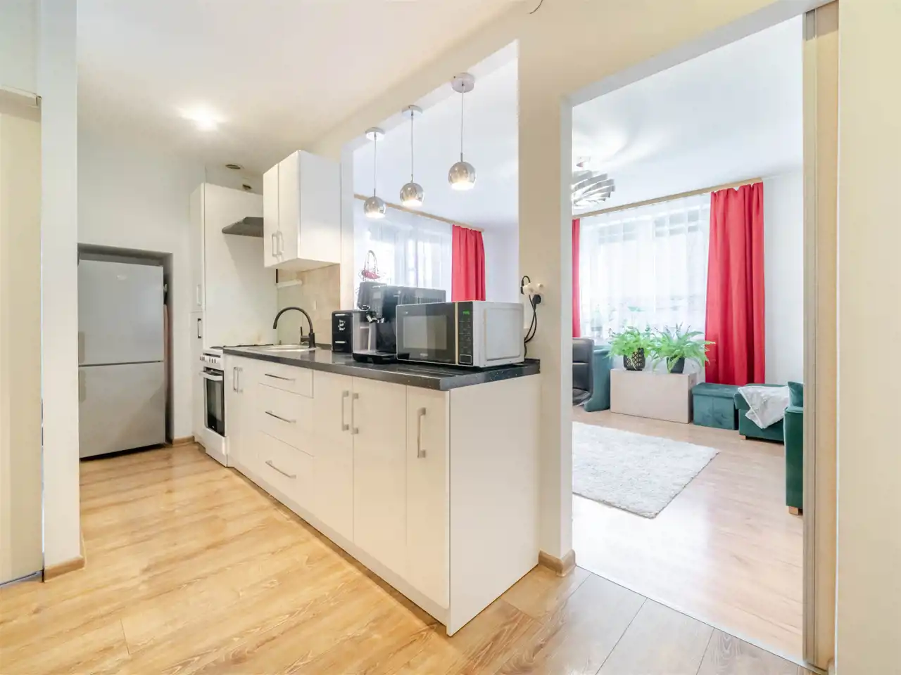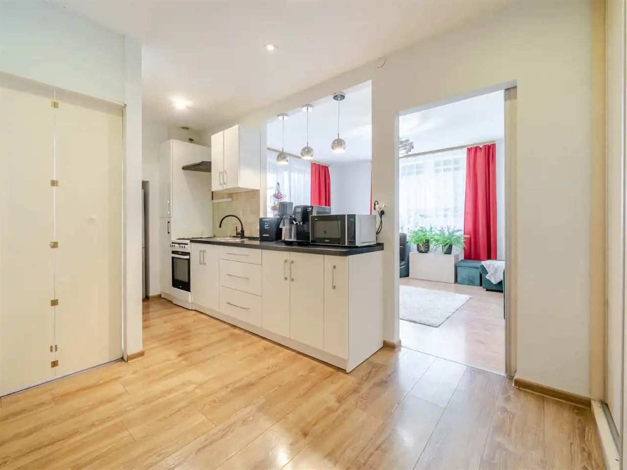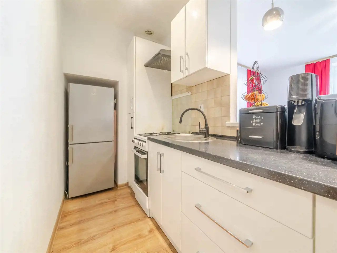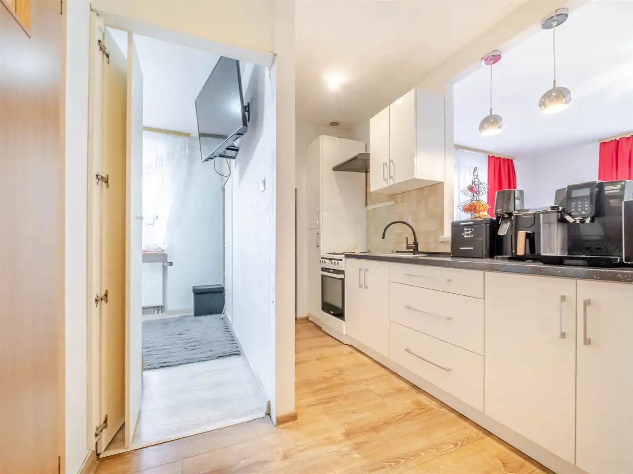 Pokoje są bardzo jasne co zawdzięczają ekspozycji na wschód i południe oraz dużym oknom i niskiej zabudowie wokół. Kuchnia jest umeblowana i wyposażona.