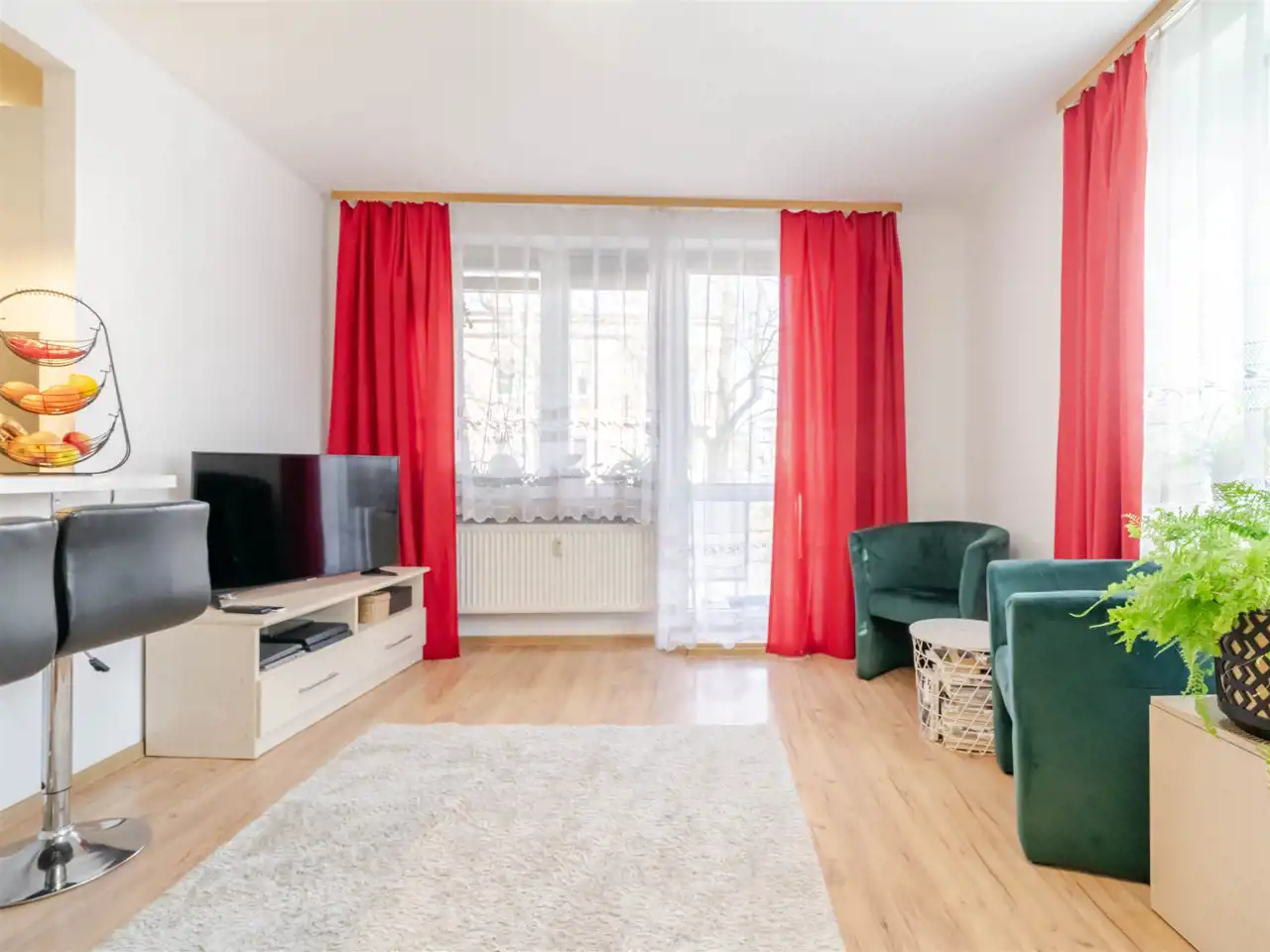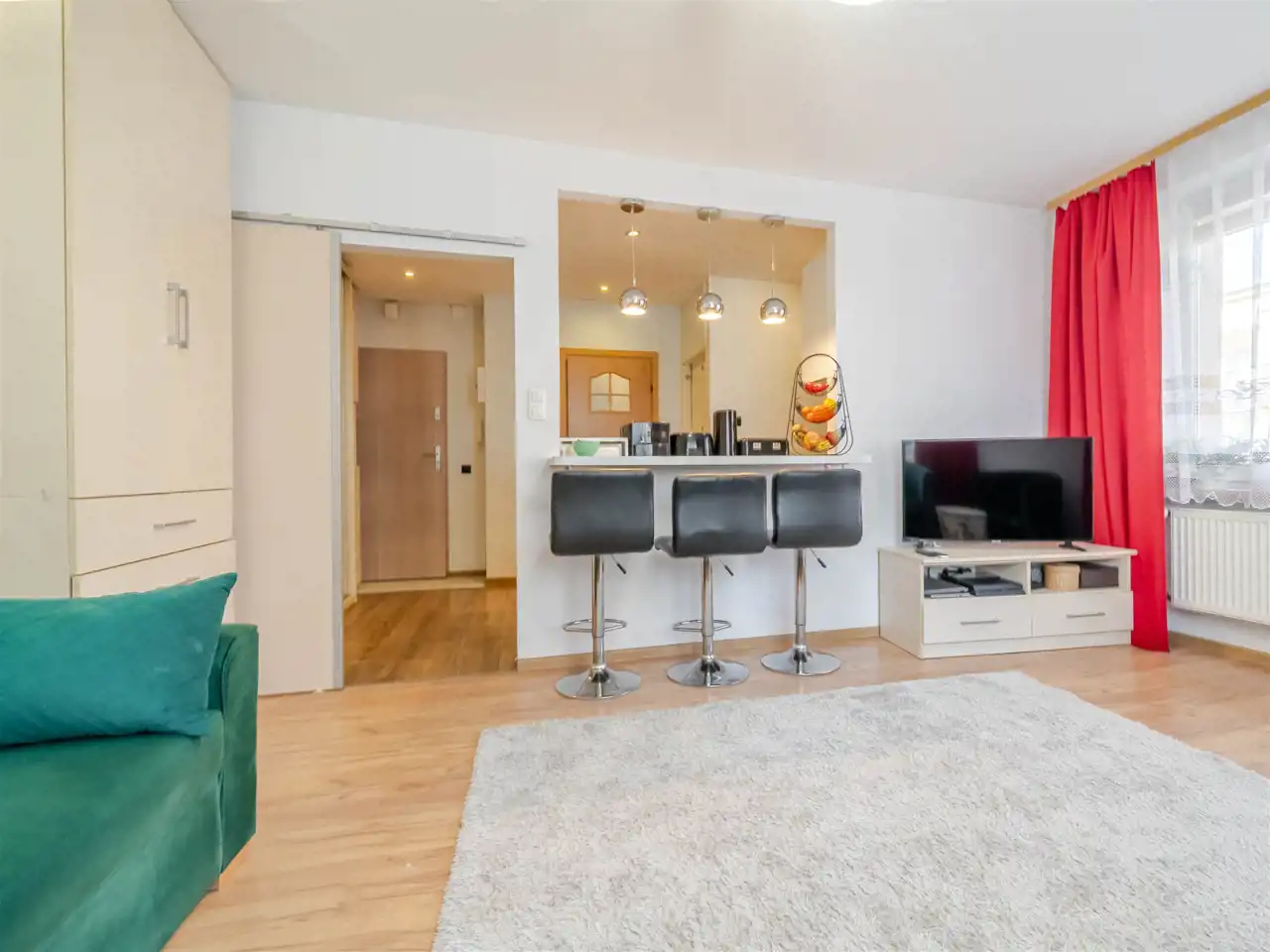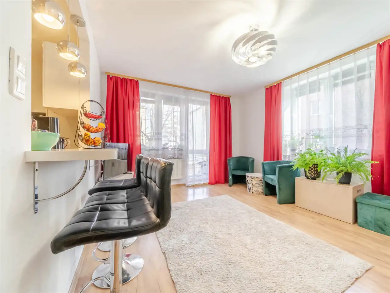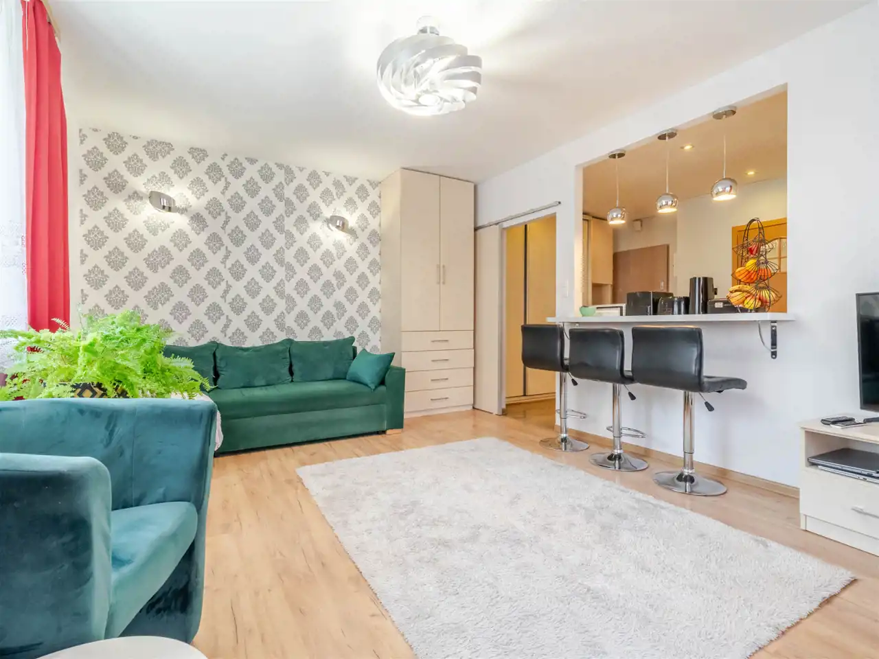 Pokoje są bardzo jasne co zawdzięczają ekspozycji na wschód i południe oraz dużym oknom i niskiej zabudowie wokół. Kuchnia jest umeblowana i wyposażona.