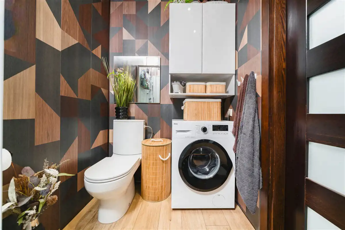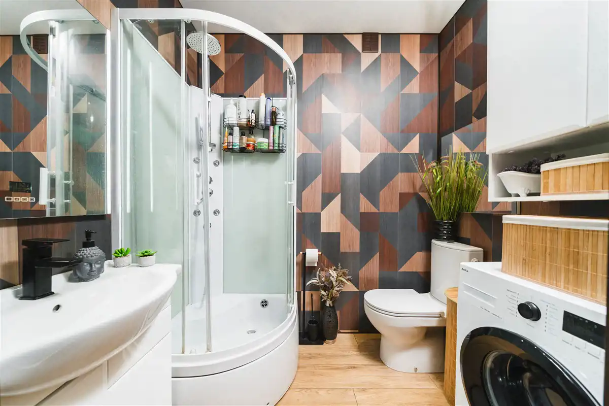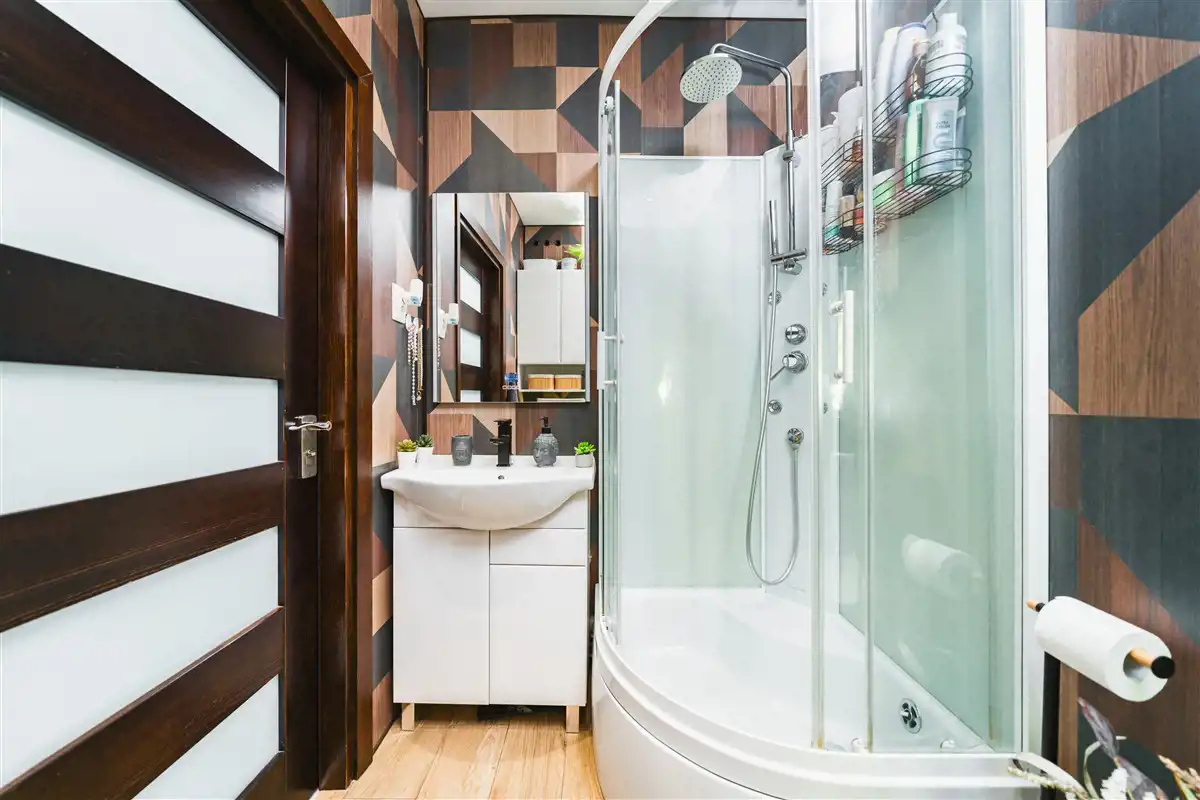 Na podłodze w pokojach są panele, natomiast w łazience i kuchni są płytki. Łazienka wyposażona w kabinę prysznicową i WC, wykończona w płytkach.