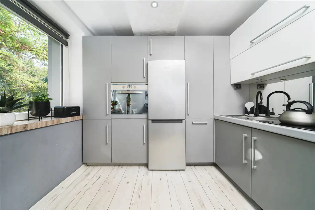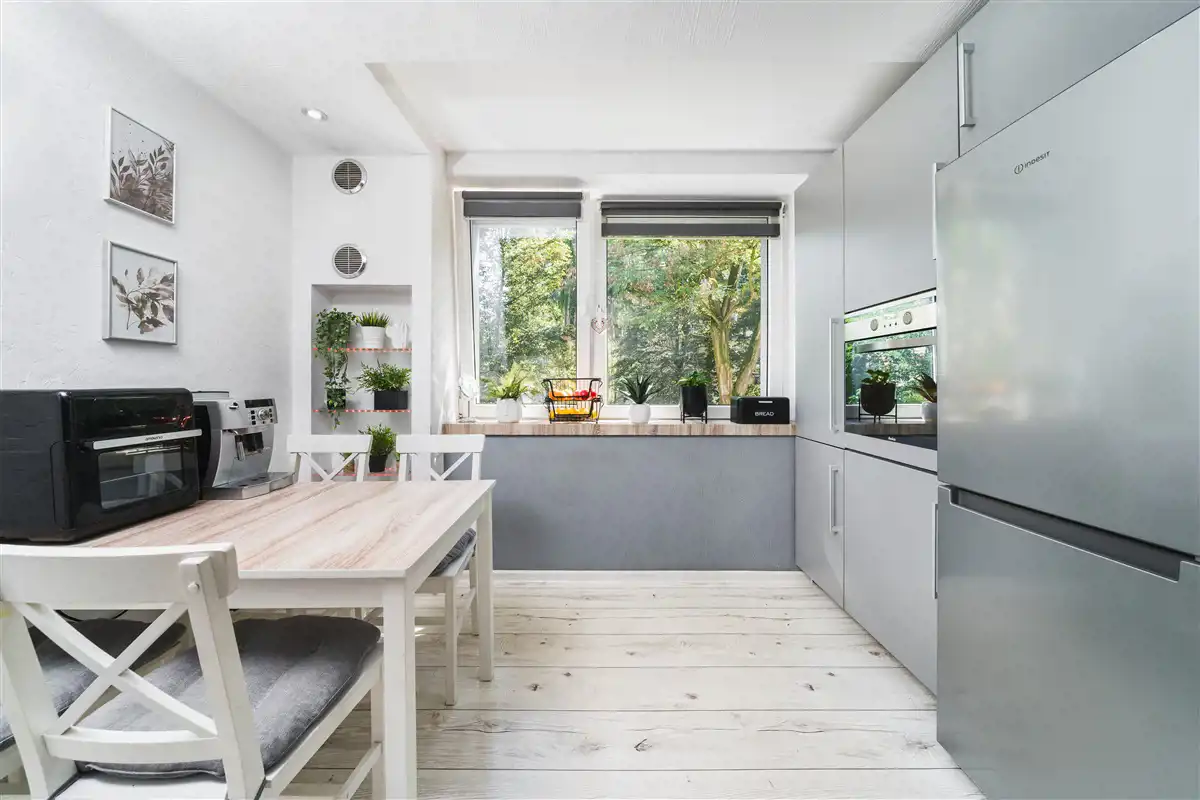 Kuchnia wyposażona jest w lodówkę, zmywarkę, płytę elektryczną, piekarnik i okap.