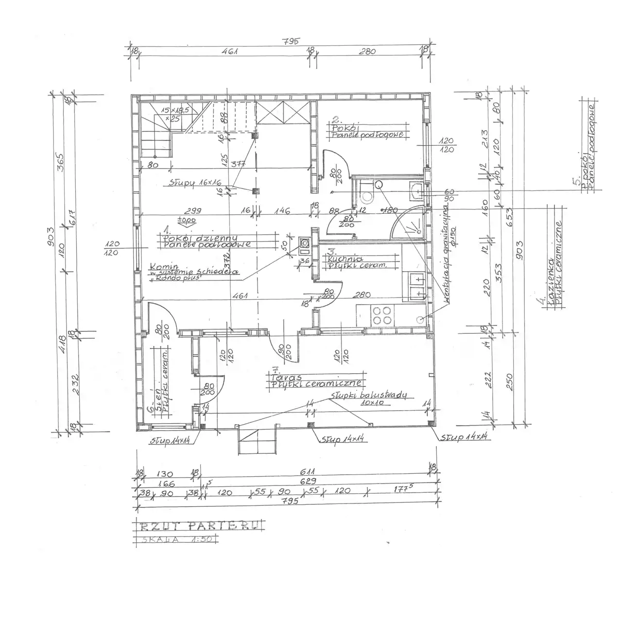 - Fundamenty betonowe. Strop nad parterem drewniany.