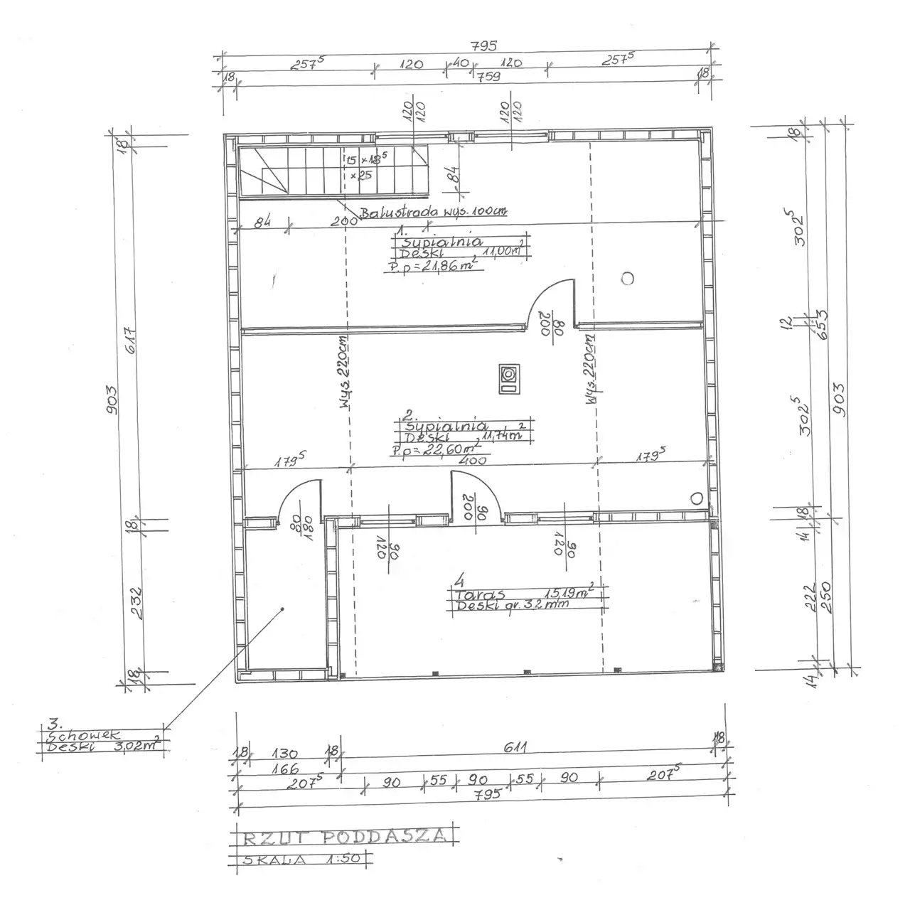 Powierzchnia użytkowa poddasza z tarasem: 40.95 m² (sypialnia 11.74 m² sypialnia 11 m² hol 3.02 m² taras 15.19 m²).