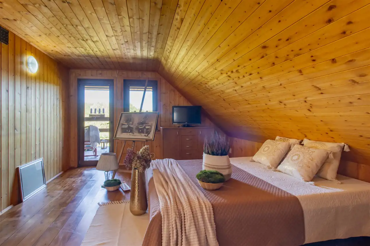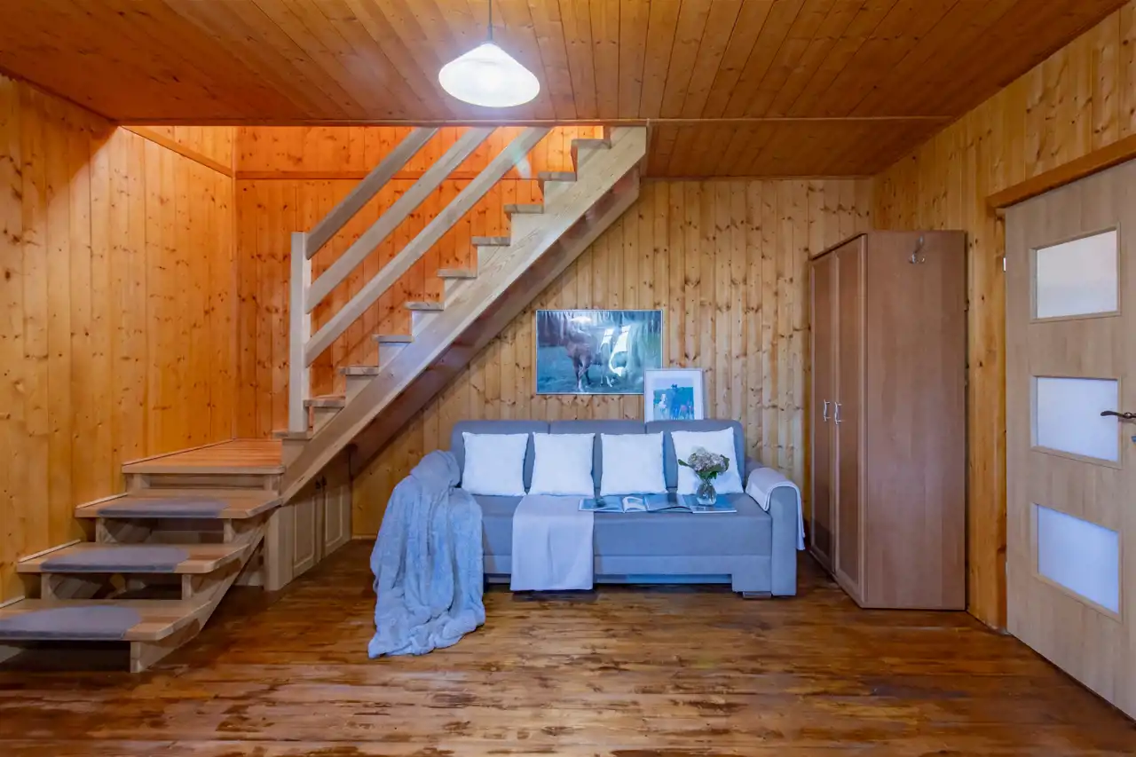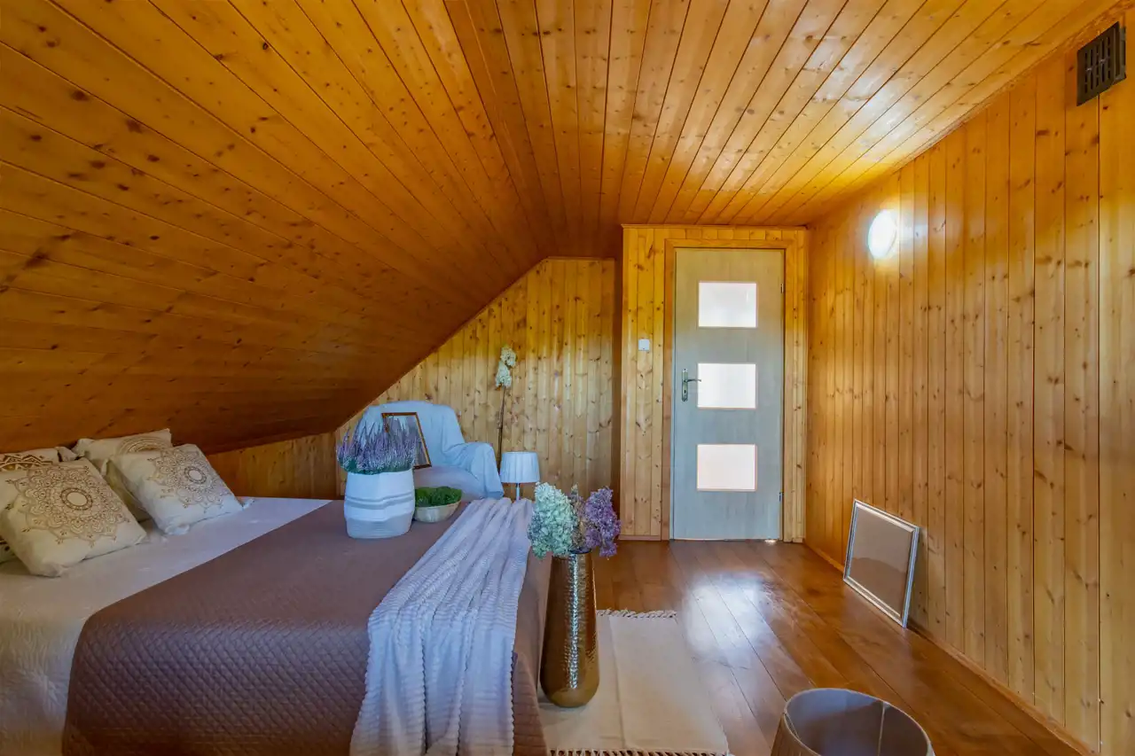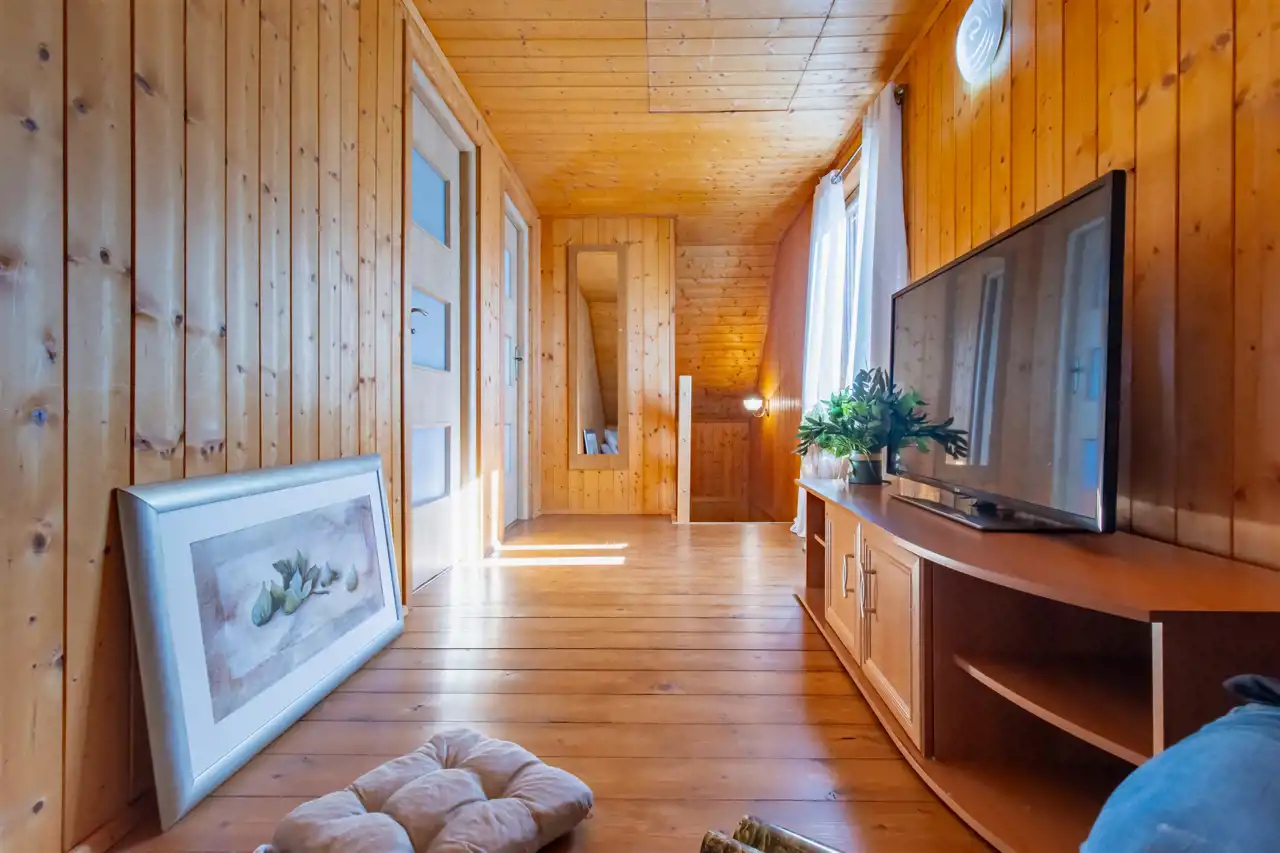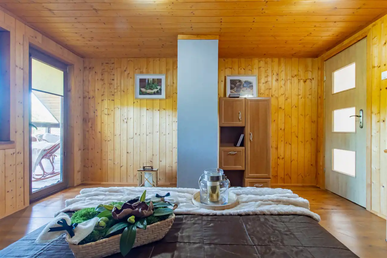 - Ściany drewniane wykończone deską boazeryjną.