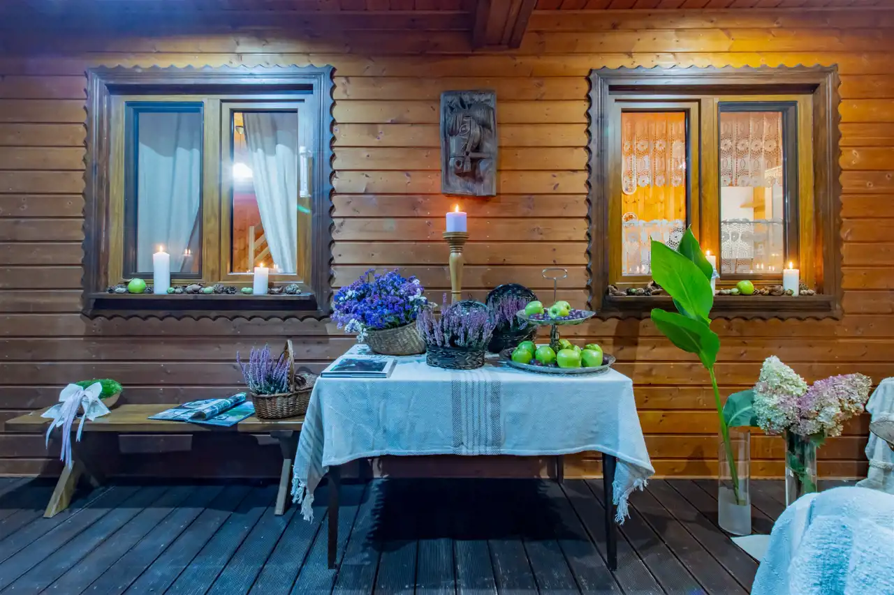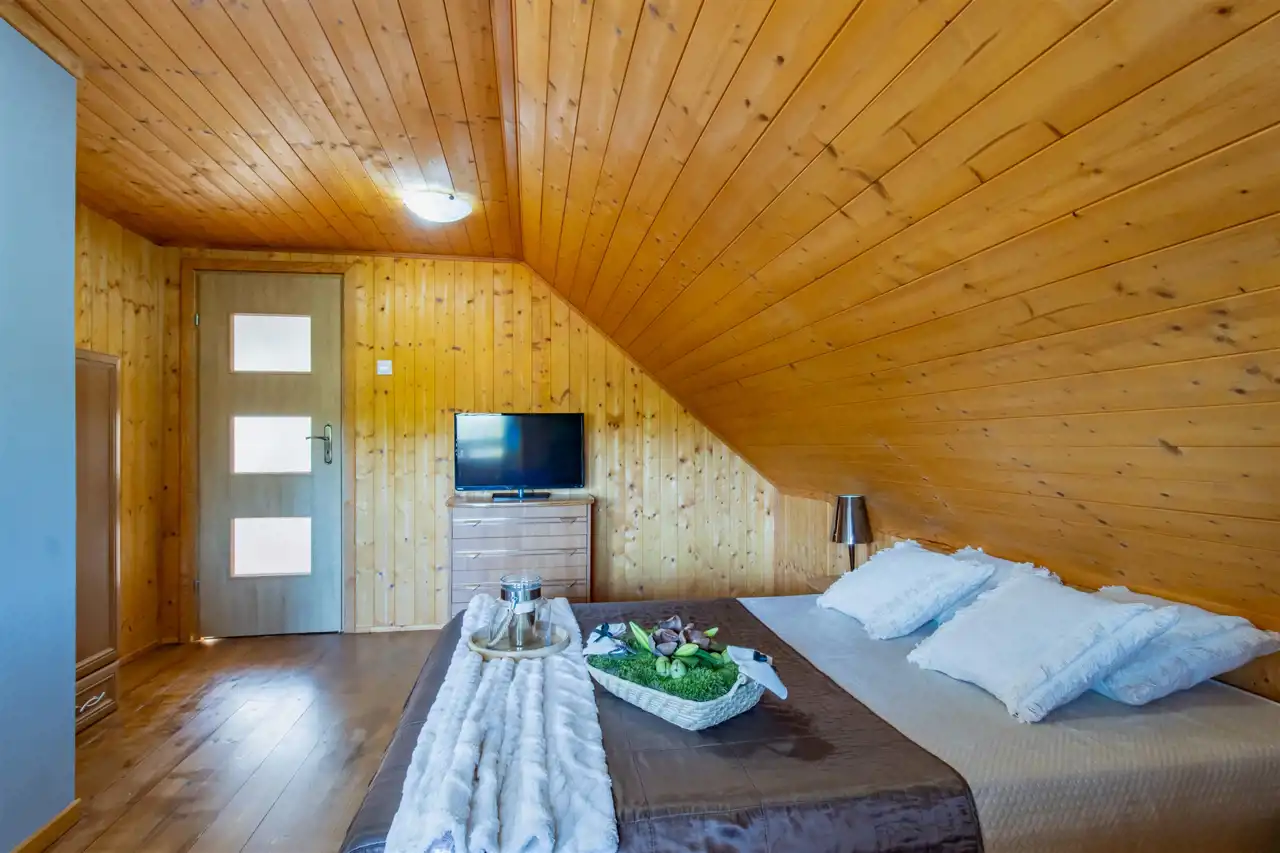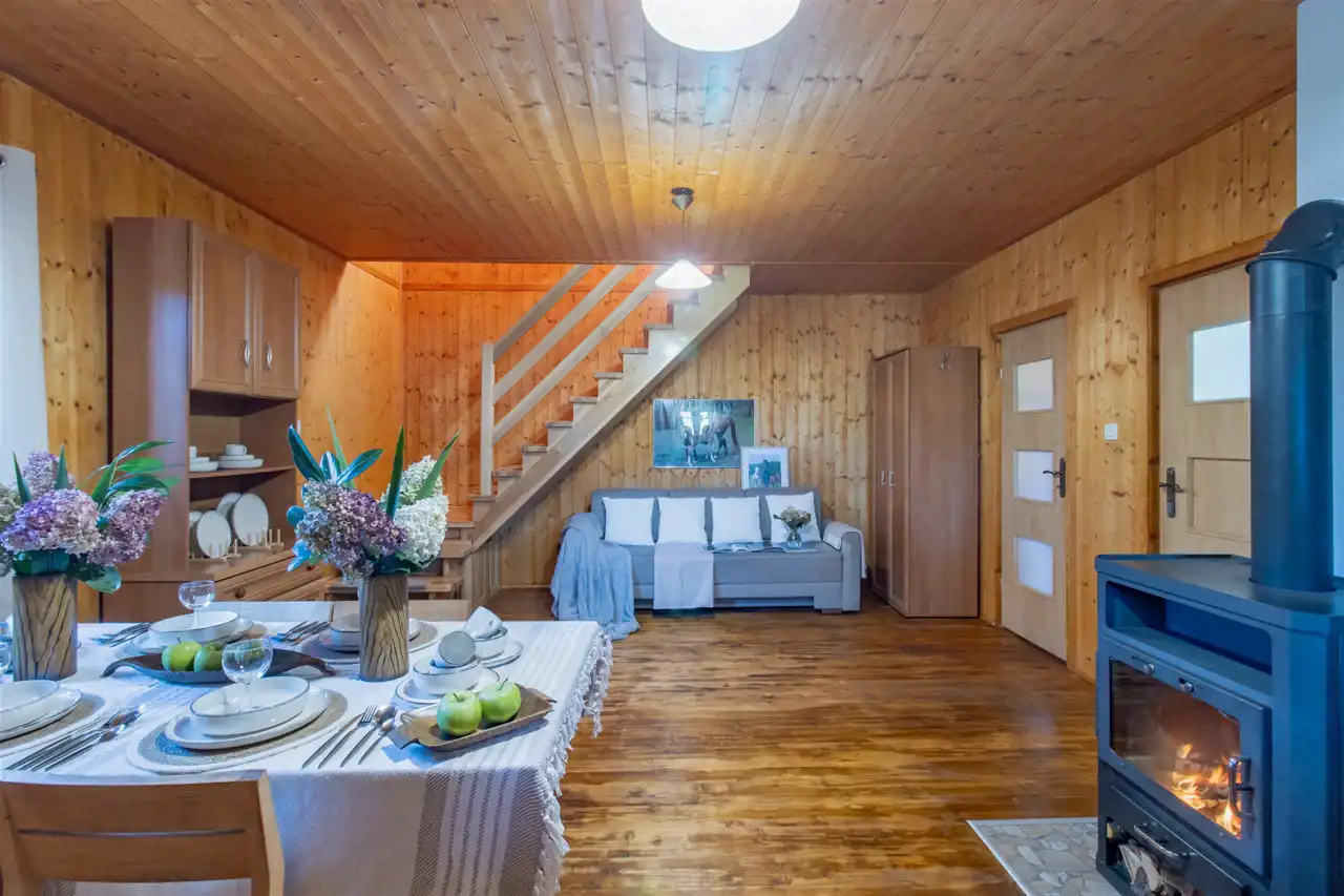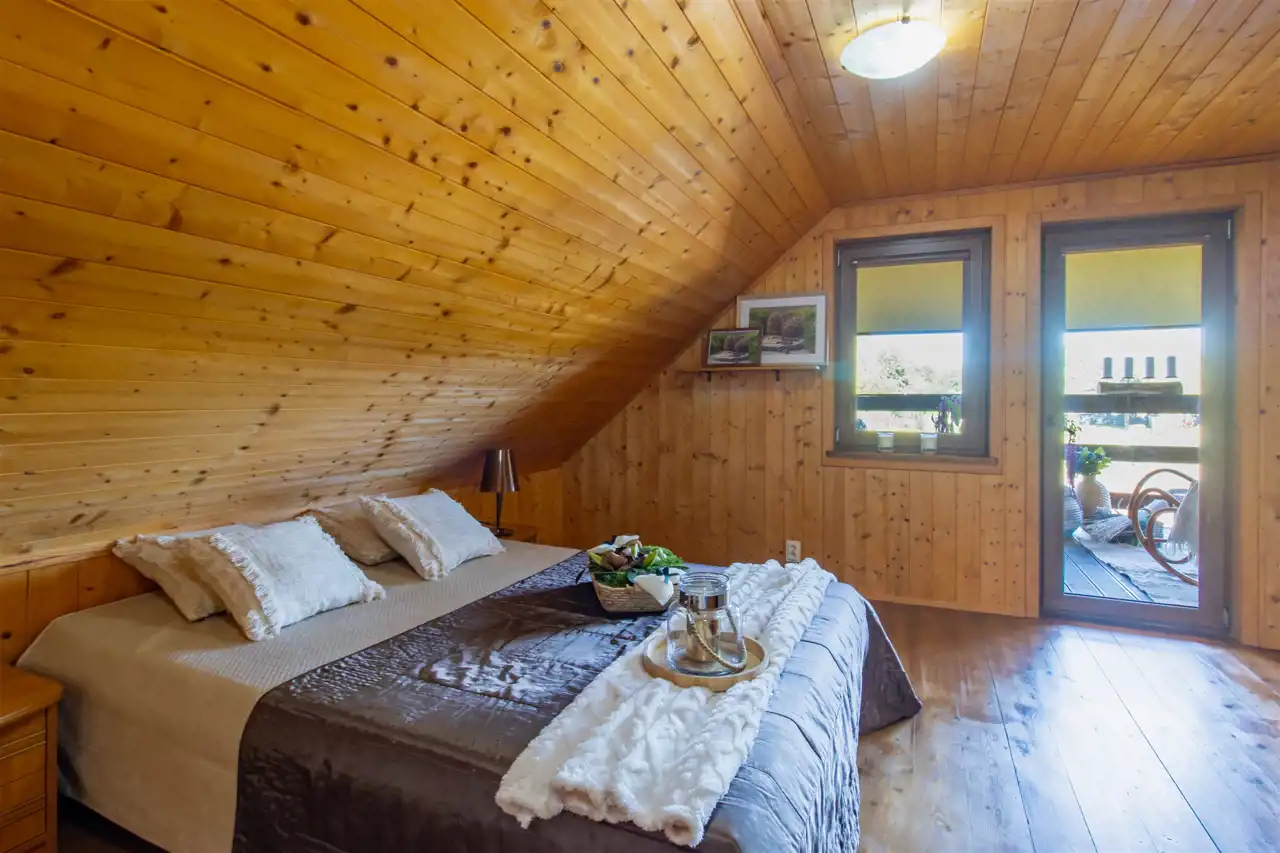 - Ściany drewniane wykończone deską boazeryjną.