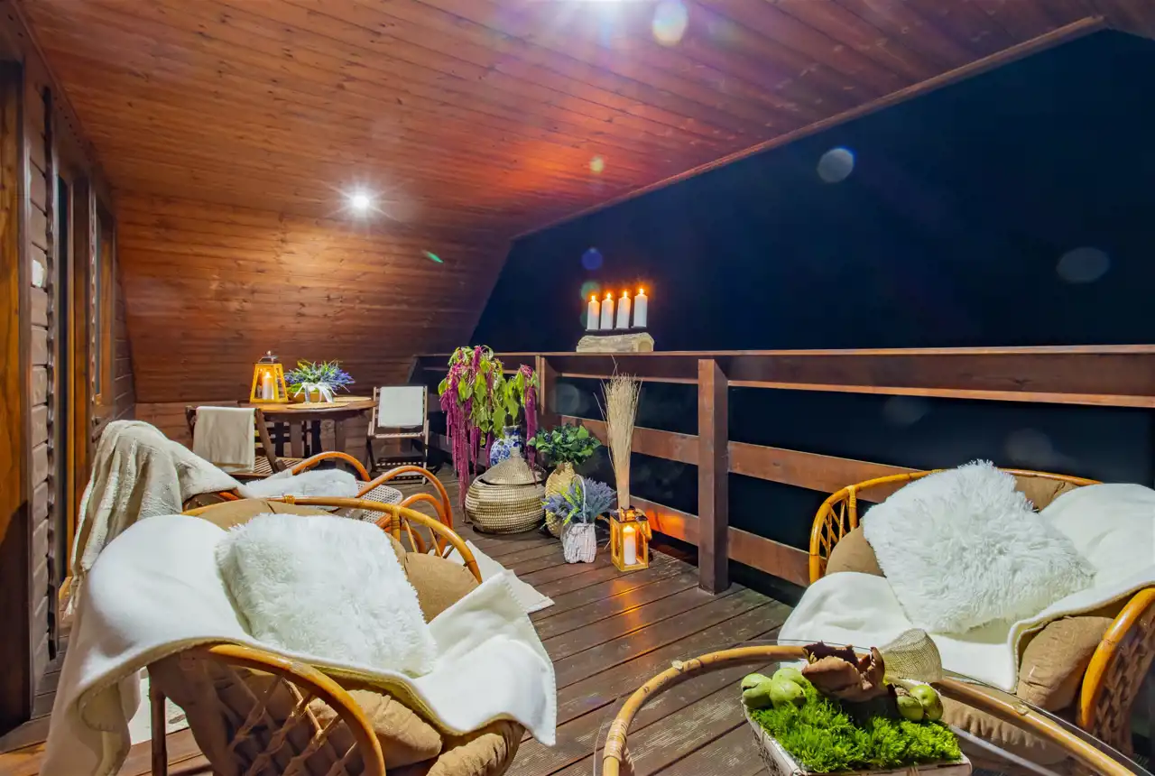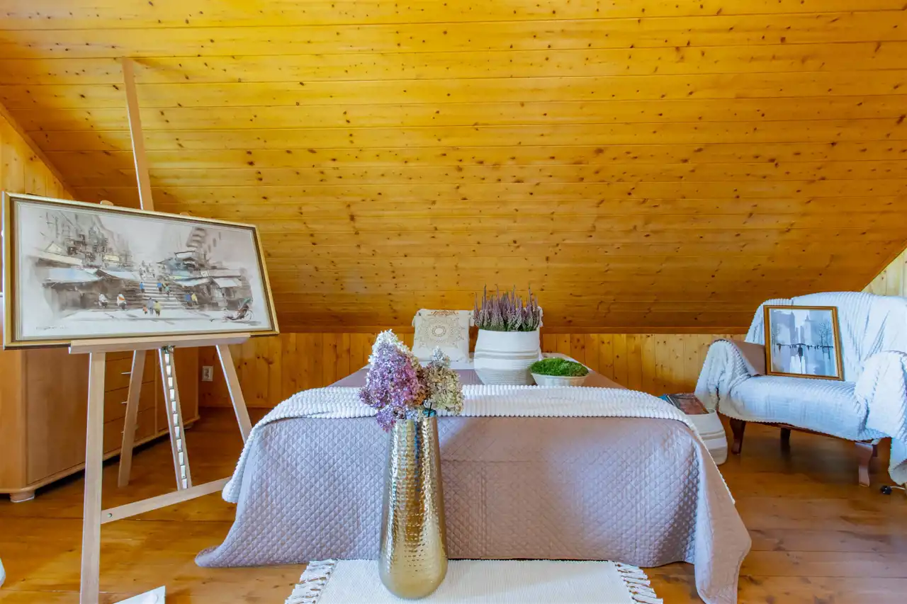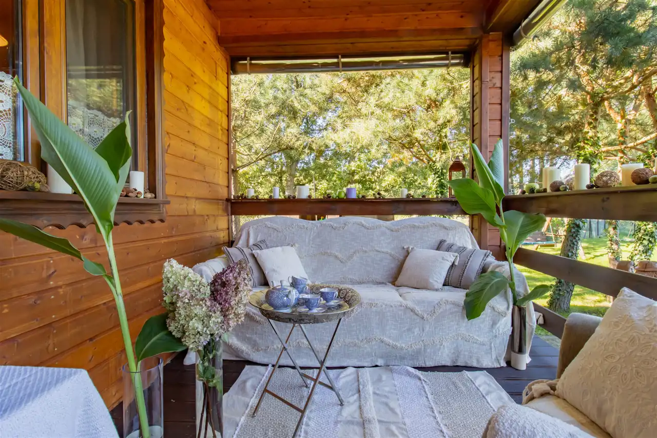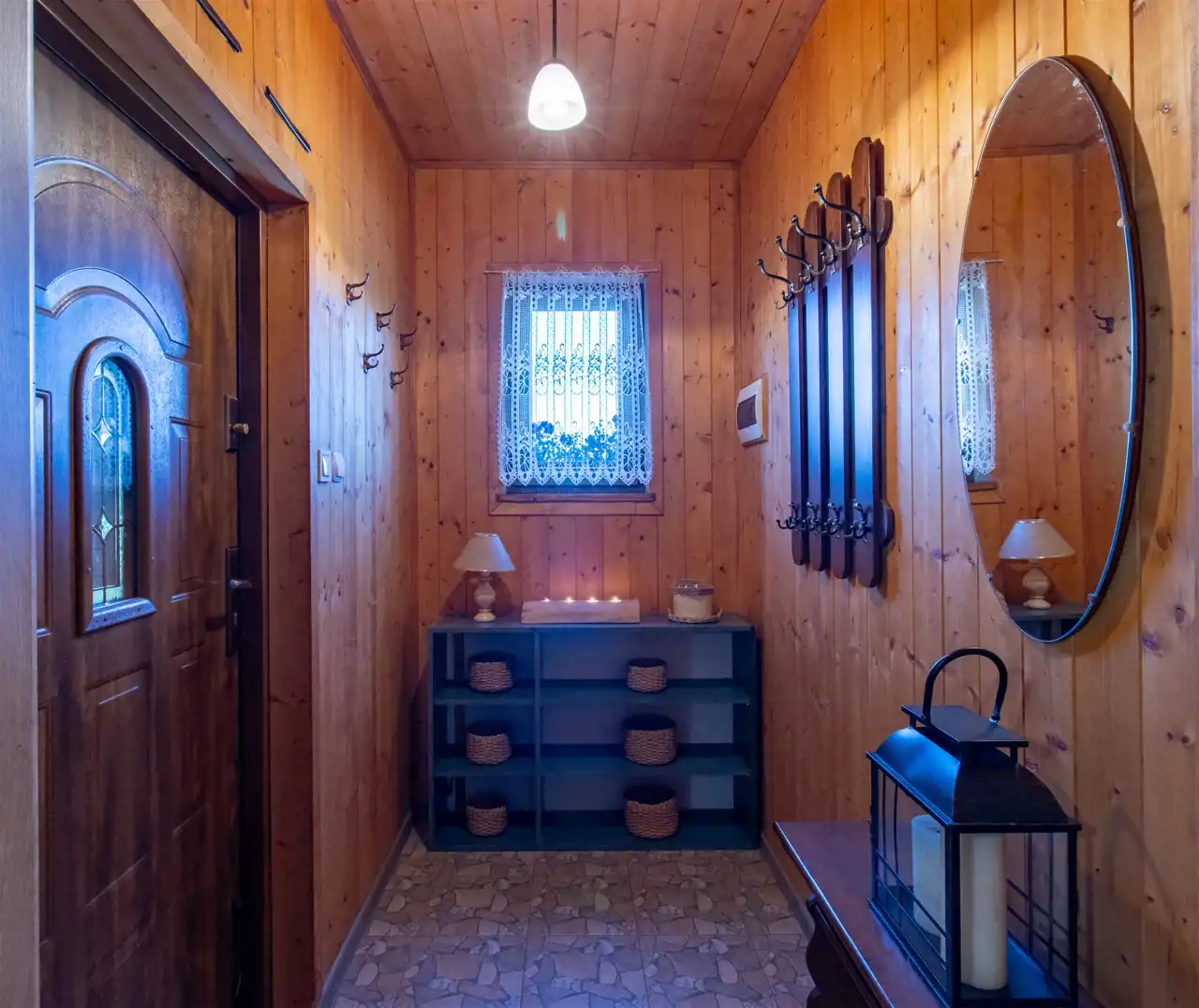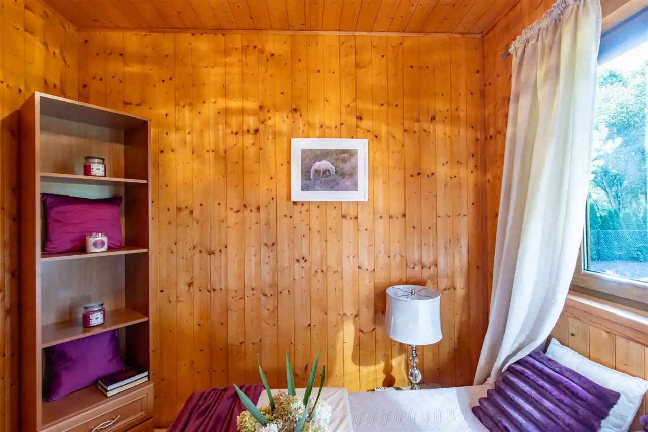 - Ściany drewniane wykończone deską boazeryjną.
