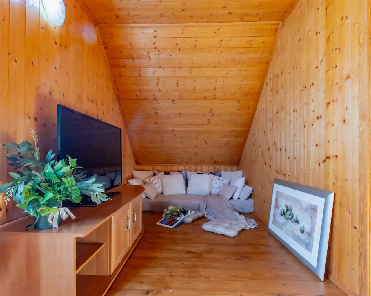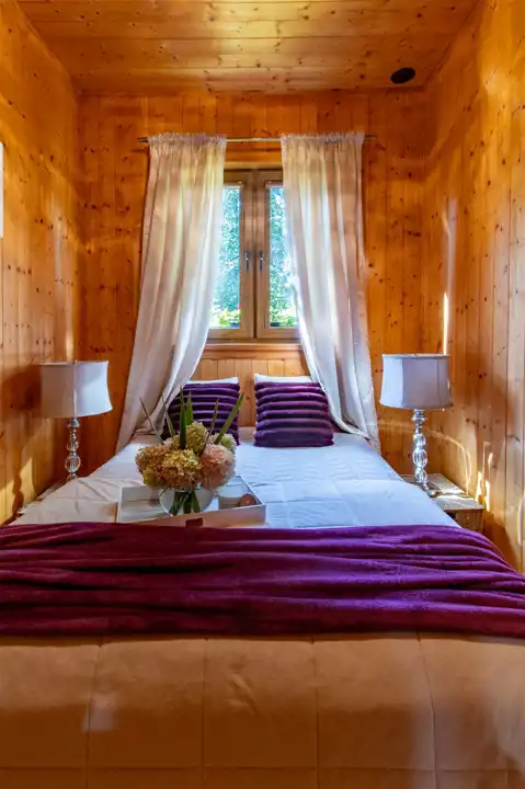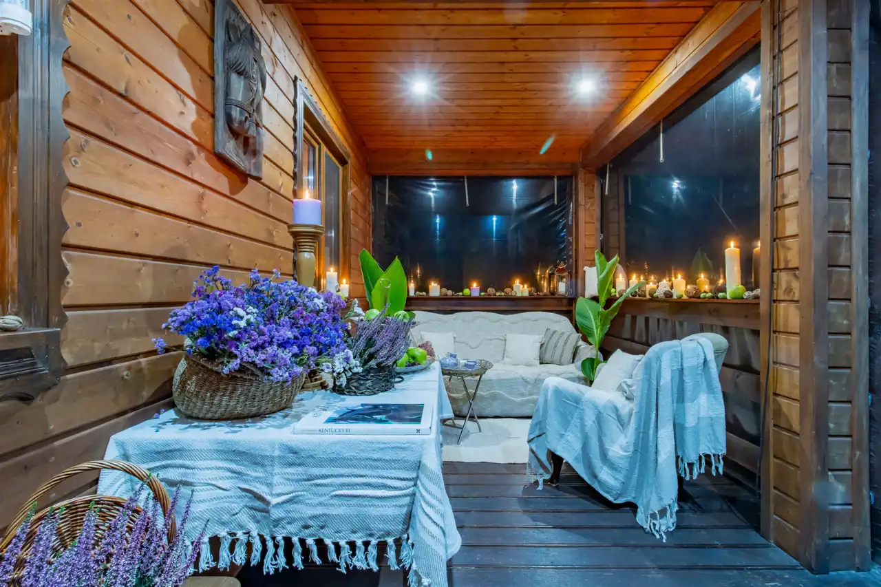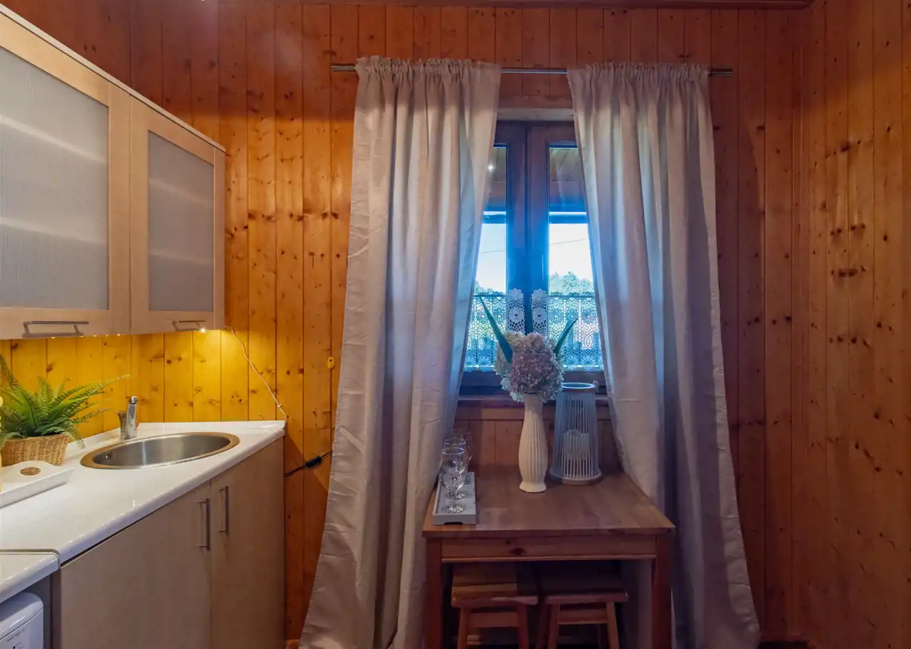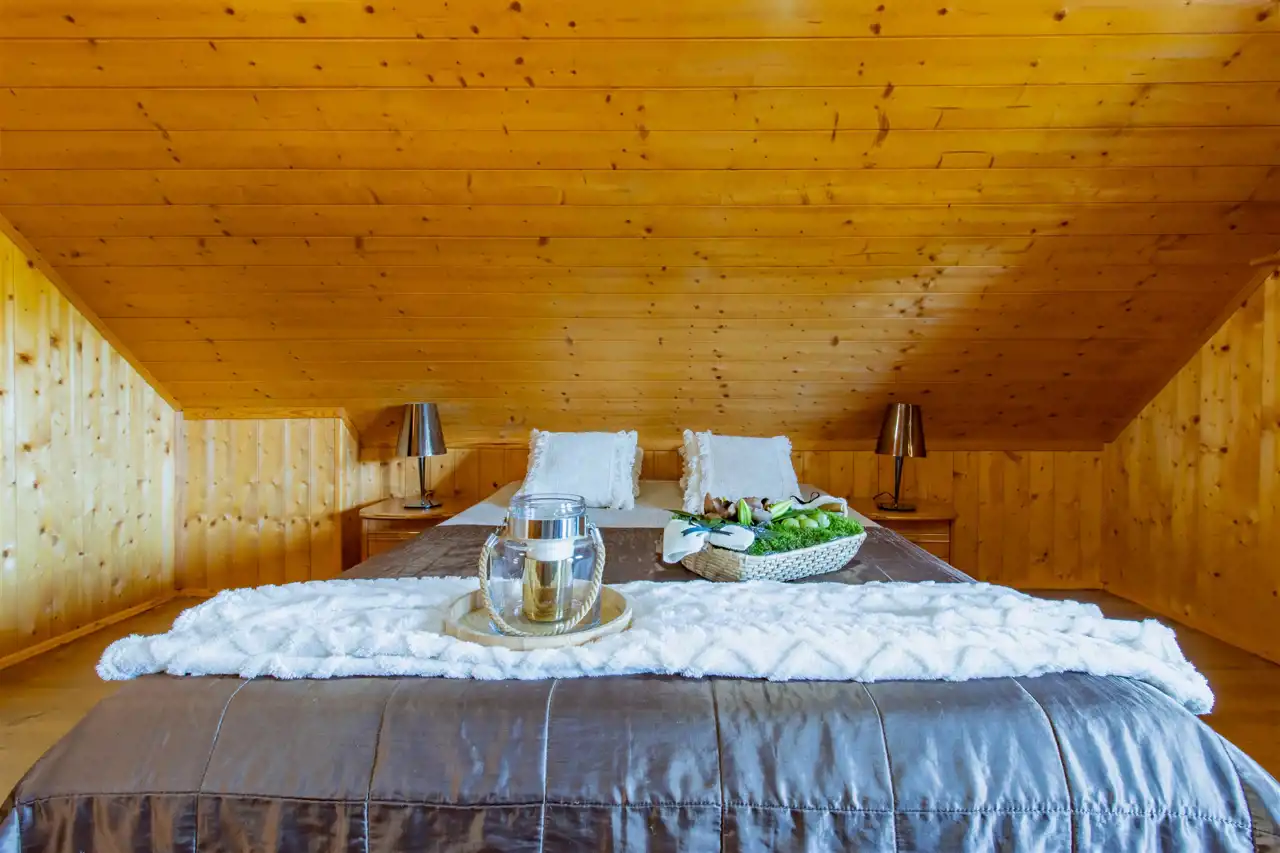- Ściany drewniane wykończone deską boazeryjną.