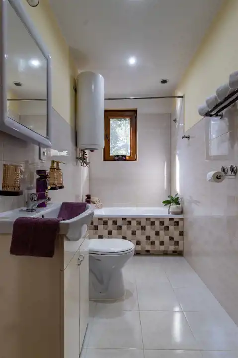 Wyposażony w instalację: elektryczną, sanitarną (szambo szczelne), wodną (miejska, podgrzanie wody bojlerem elektrycznym).