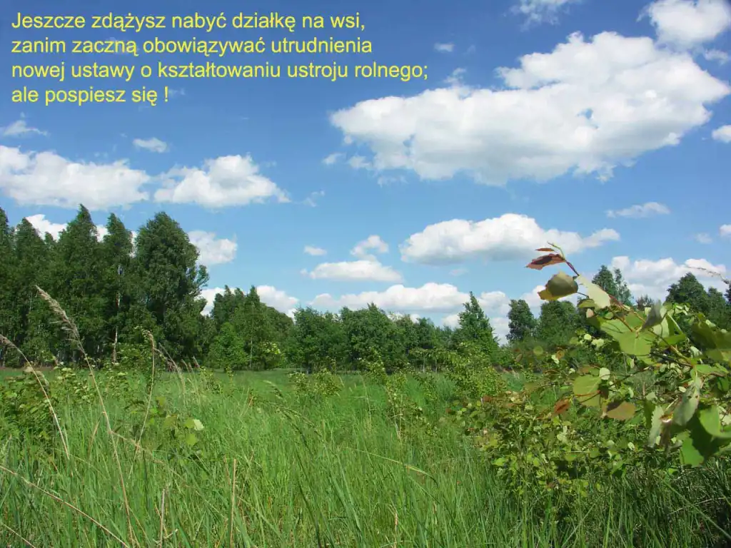W ofercie sprzedaży: obszar o powierzchni 2,12 ha gruntów rolnych, V/VI klasy bonitacyjnej, położony w odległości 5 km od Skierniewic, na skraju Puszczy Bolimowskiej, w obrębie Bolimowskiego Parku Krajobrazowego, na terenie gminy Skierniewice. Istnieje możliwość podziału na kilka mniejszych działek inwestycyjnych, wzdłuż wyodrębnionej drogi gminnej i uzyskania dla nich pozwolenia na zabudowę całoroczną, rekreacyjną lub zagrodową; doprowadzenia wody bieżącej z wiejskiego wodociągu oraz podłączenia do linii telefonicznej, z szerokopasmowym internetem, przebiegającej w bliskiej odległości. Wykonane jest przyłącze elektryczne kablem podziemnym.