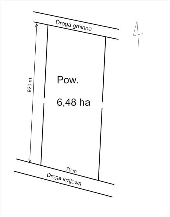 Działka o wymiarach 70m x 920m krótszymi bokami przylega do dróg asfaltowych.