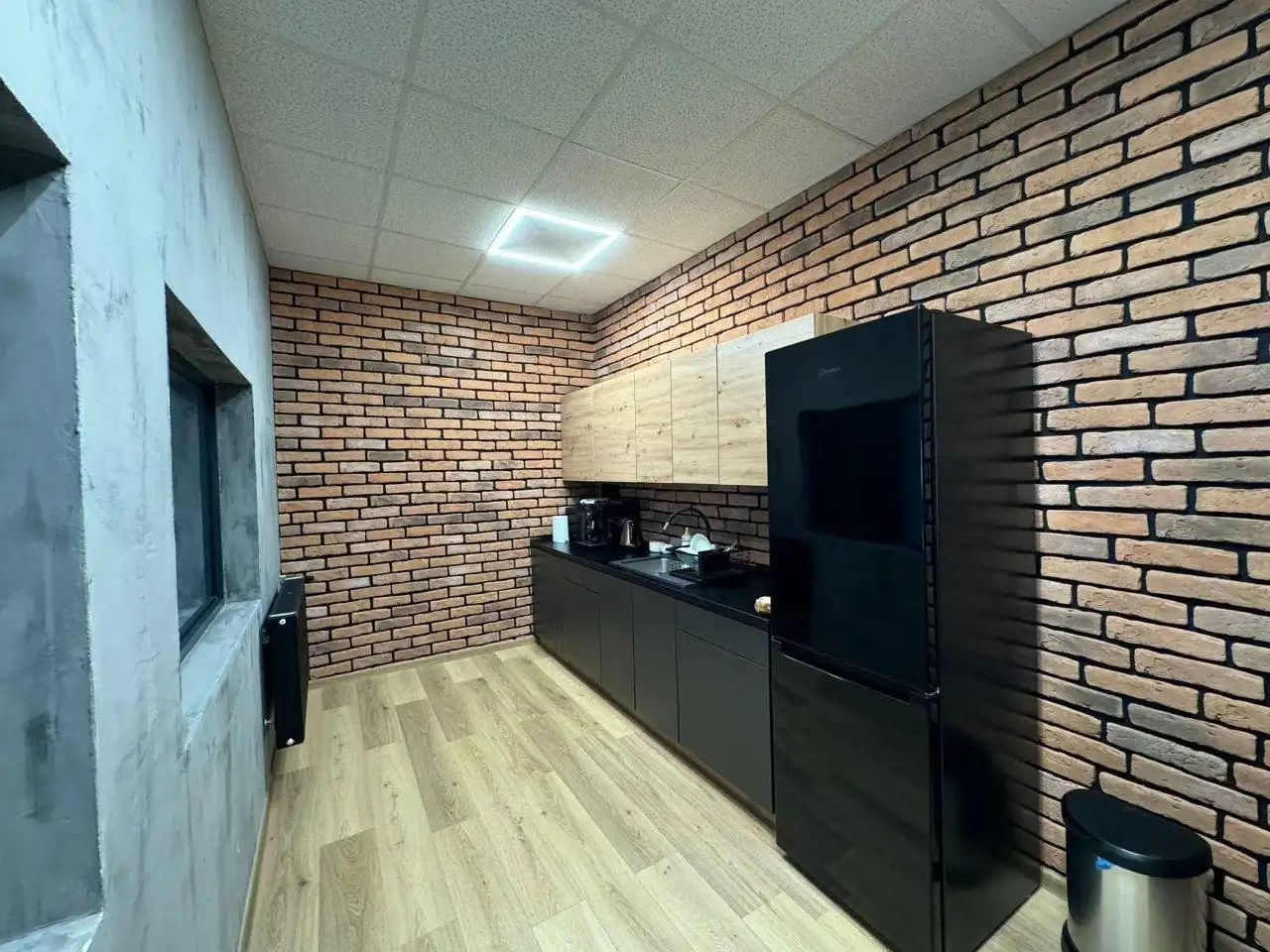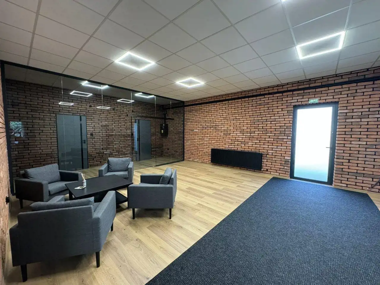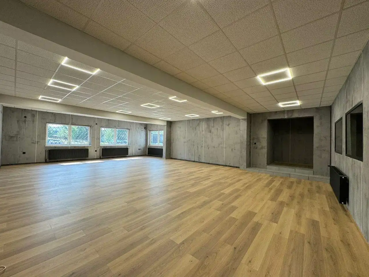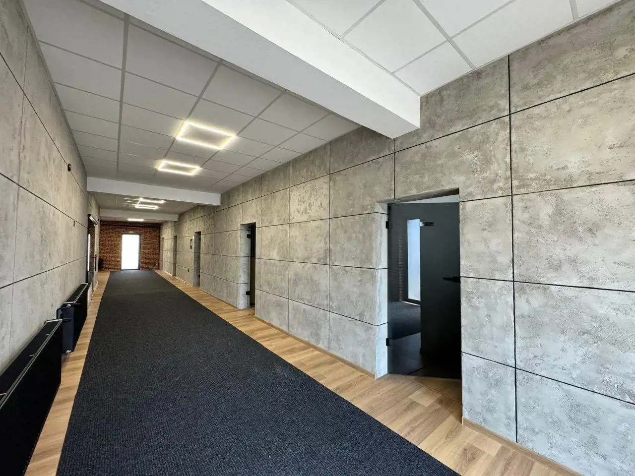 - W biurach i open-space podłogi panele. Sufity podwieszane, oświetlenie LED.