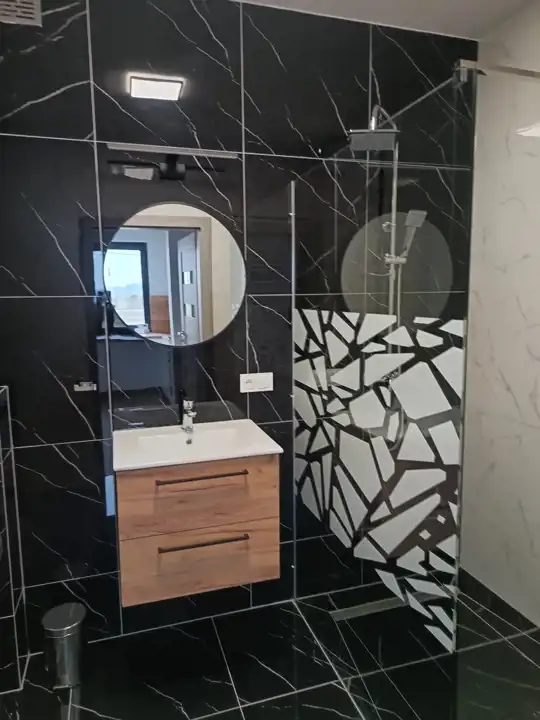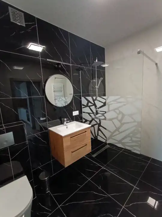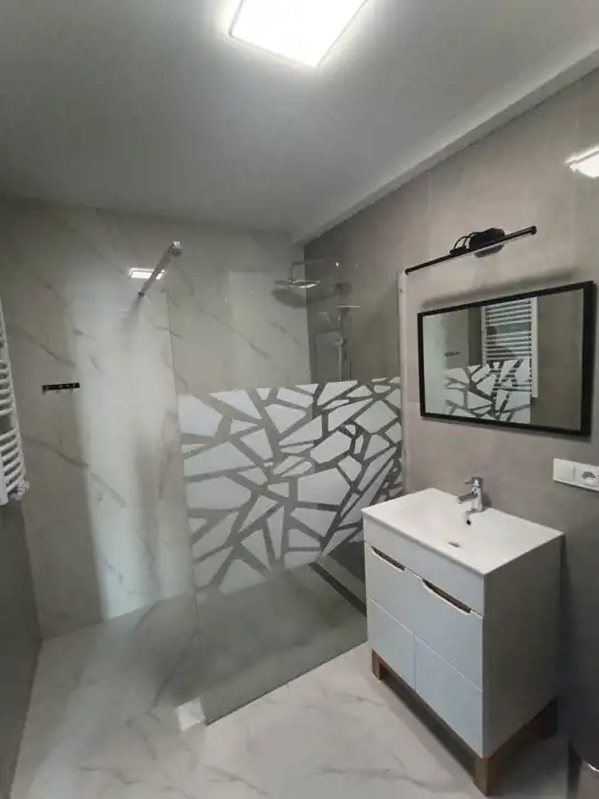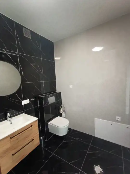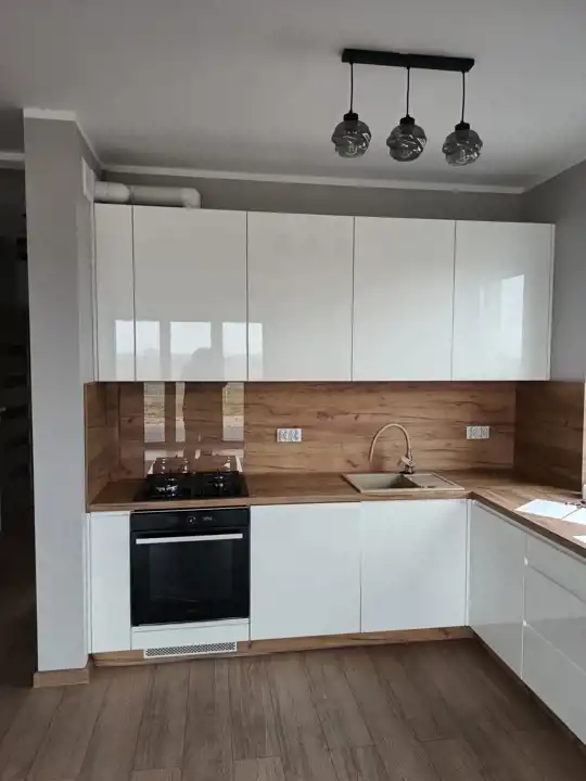 Ogrzewanie podłogowe we wszystkich pomieszczeniach, na podłogach panele, kuchnia w zabudowie, sprzęt agd-plyta, piekarnik zmywarka. W łazienkach prysznice.