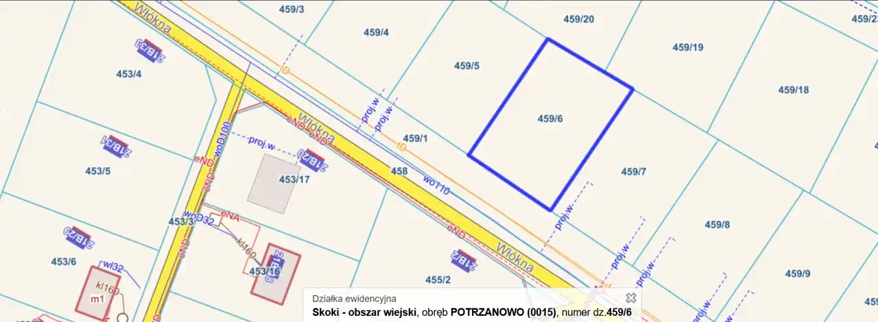 Działka z WZ na nowo powstającym osiedlu w pobliżu plaży nad jeziorem Włókna pod Skokami. W drodze dojazdowej prąd, wodociąg i światłowód. Gmina rozpisała przetarg na wykonanie drogi asfaltowej do osiedla.