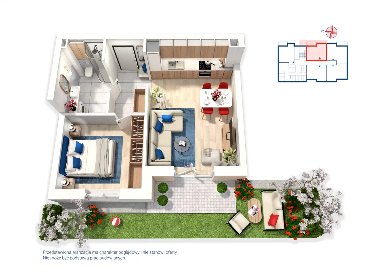 Do mieszkania przynależy komórka lokatorska o pow. 1,95 m2 oraz ogrodzony ogródek położony bezpośrednio przy tarasie.