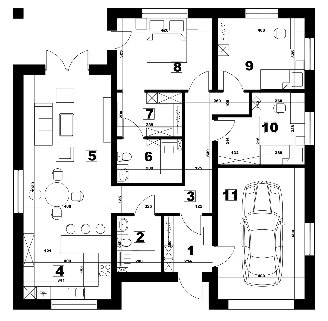 Dom o powierzchni użytkowej 113,28 m2 (całkowitej 136,96 m2) został zaprojektowany z myślą o wygodzie mieszkańców. Na parterze znajduje się przestronny salon z jadalnią, idealny do spędzania czasu z rodziną i przyjaciół. W duża, jasna kuchnia zachwyci każdego miłośnika gotowania. Dodatkowo znajdują się tu trzy komfortowe sypialnie, dwie łazienki oraz garderoba. Garaż w bryle budynku zapewni bezpieczne miejsce dla Twojego samochodu.
