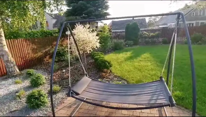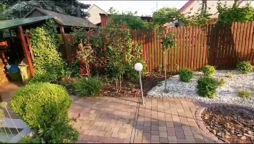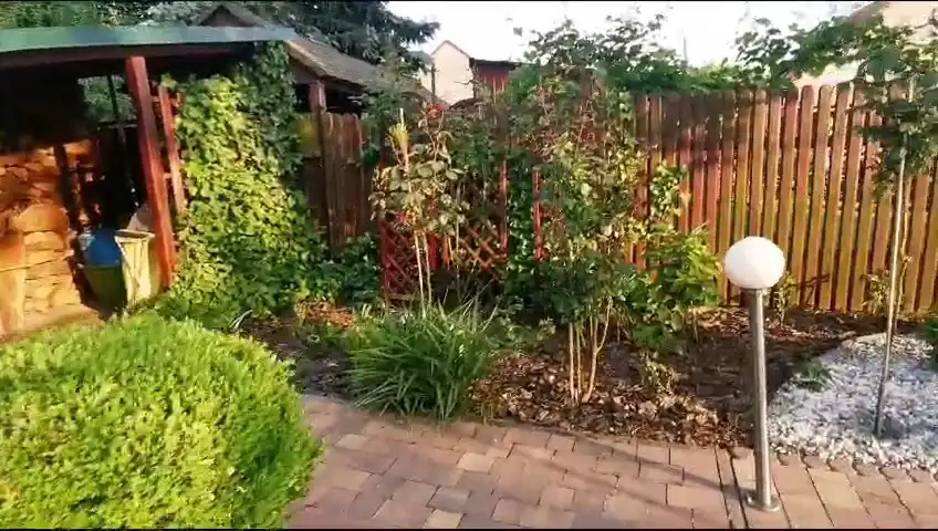 Zaprojektowane i zagospodarowane poprzez rośliny różnego typu, zieleń zimozieloną, ścieżki z polbruku, dodatkowo wydzielone jest miejsce do wypoczynku, domek na drewno. Ogród jest samowystarczalny, nawadniany automatycznie, cały czas jest on pod opieką ogrodnika.