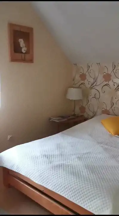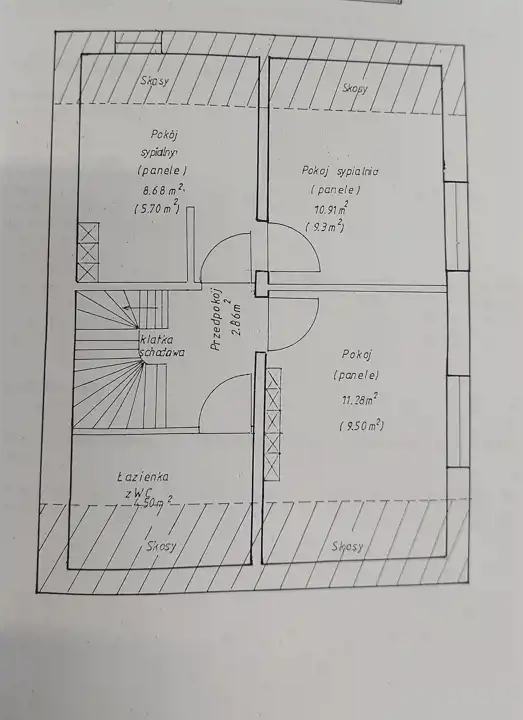 Do góry prowadzą wygodne schody, z przedpokoju - 2,86mkw, jest wejście do trzech sypialni - 8,68mk, 10,91mkw, 11,28mkw, oraz łazienki wraz z WC 4,5mkw, dodatkowo na poddaszu znajduje się zaadoptowany strych, który może pełnić funkcje czwartej sypialni.