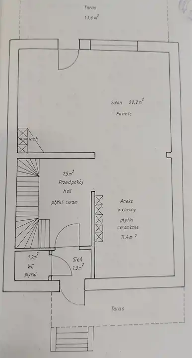 CZĘŚĆ DZIENNA PARTER: która składa się z wiatrołapu 1,3mkw, hollu 7,5mkw, WC-1,2mkw, przestronnego salonu 22,2mkw z którego wyjście jest na słoneczny taras, oraz serca domu wygodnej kuchni w formie aneksu kuchennego 11,4mkw