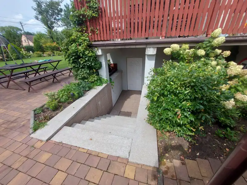 - Piec akumulacyjny na dolnym piętrze, który odprowadza ciepło na cały dom