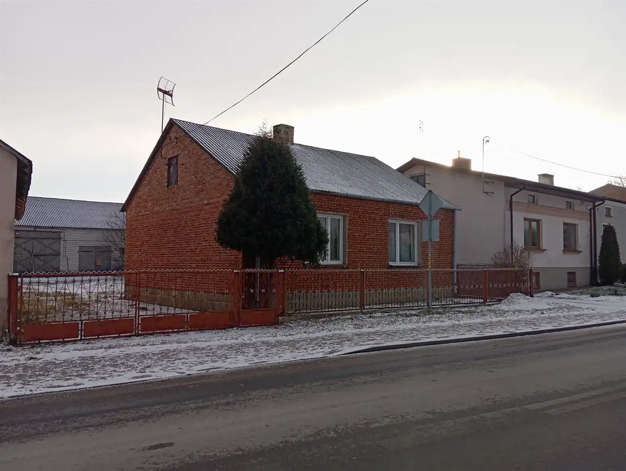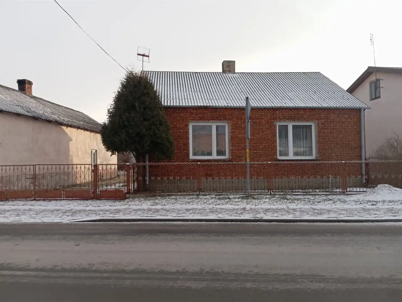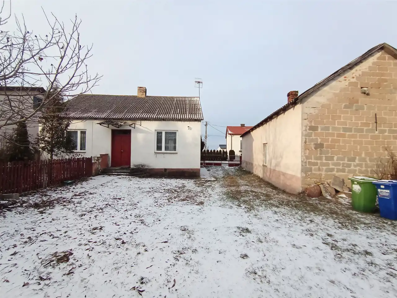 Podstawowym materiałem budowlanym jest cegła. Dach pokryty eternitem. Okna PCV.