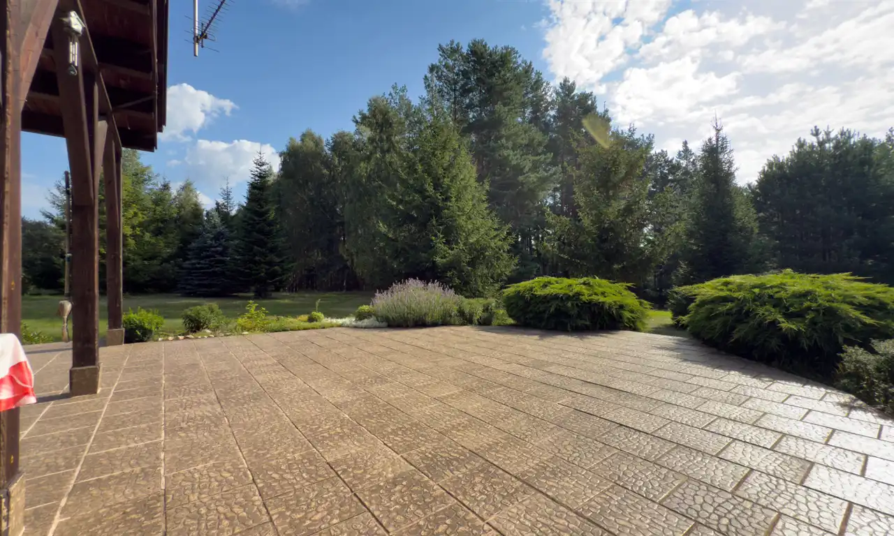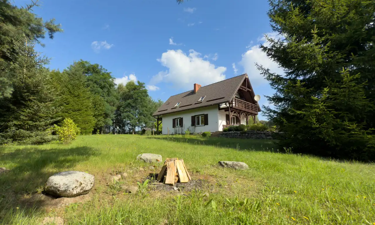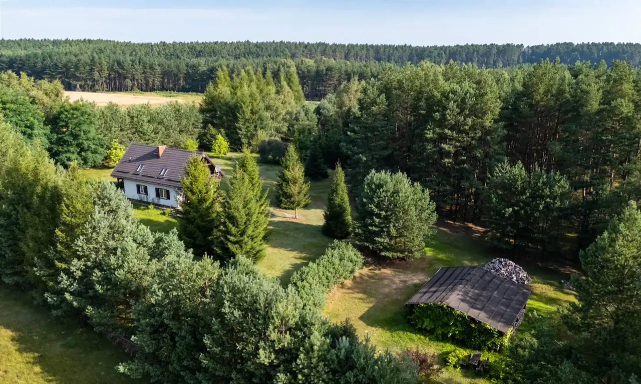 Ogromnym atutem tej nieruchomości jest bardzo duża działka o powierzchni aż 2,5 ha (dokładnie 2,5646 m²). Dom otoczony jest własnym lasem, co gwarantuje całkowitą prywatność i spokój. Teren jest ogrodzony drewnianym płotem i w pełni przygotowany do rekreacji na świeżym powietrzu. Znajduje się tu miejsce na ognisko, drewniany budynek gospodarczy z drewutnią i częścią gospodarczą, a także duży taras, który świetnie sprawdzi się podczas spotkań z bliskimi, lub wieczornego relaksu i podziwiania gwiazd. To miejsce daje ogromne możliwości – od stworzenia ogródka warzywnego, czy zbierania grzybów na własnym terenie, przez budowę sauny lub ustawienie jacuzzi, aż po relaks w hamaku zawieszonym między drzewami, czy nawet wykonywanie pracy zdalnej z widokiem lasu za oknem.