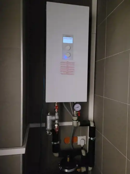 Ogrzewanie domu wytwarzane w węźle zasilanym energią elektryczną (możliwość zastosowania pompy ciepła lub fotowoltaiki) sterowany automatyką. zasobnik wody ciepłej o poj. 200l.