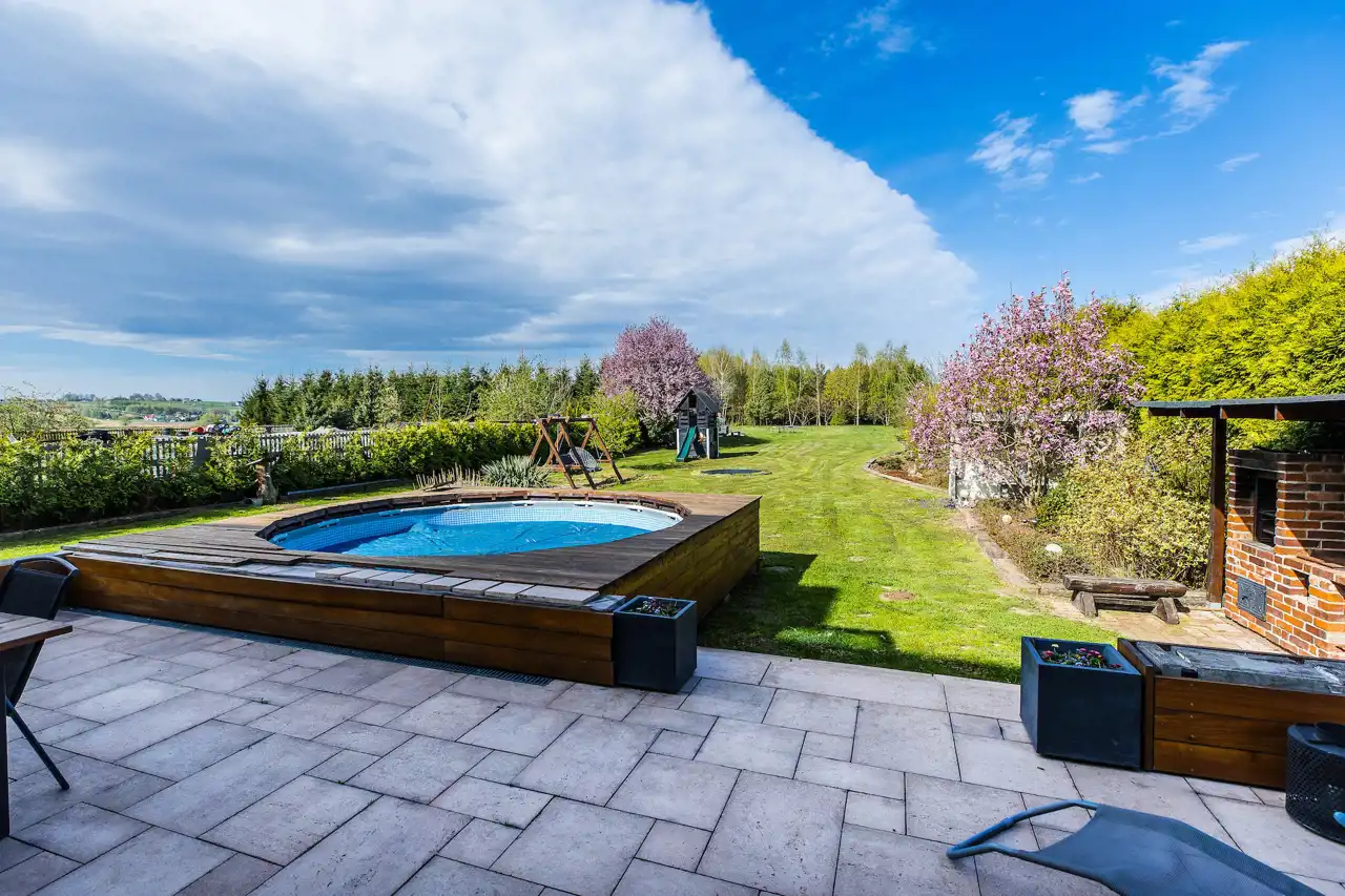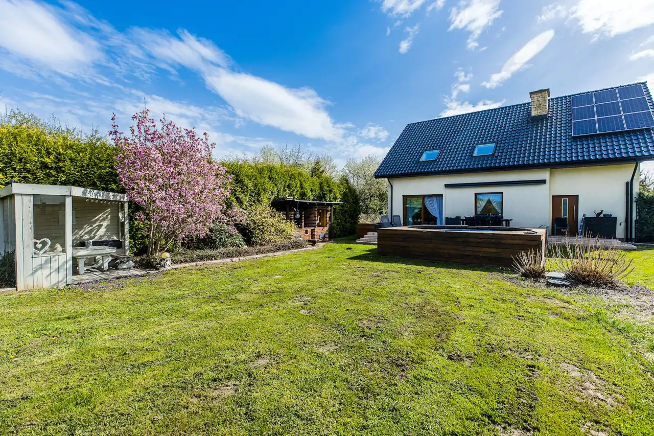 Na działce znajdują się liczne udogodnienia, które podnoszą komfort codziennego życia na świeżym powietrzu. Do dyspozycji mieszkańców jest basen, idealny na relaks w ciepłe dni, oraz przestronne stanowisko grillowe, które można wykończyć według własnych upodobań. Zadbana przestrzeń wokół domu obejmuje taras, na którym zamontowana została wysuwana markiza, zapewniająca cień i wygodę w gorące dni. Dodatkowo dom wyposażony jest instalację fotowoltaiczną, która pozwala na oszczędność energii, oraz przydomową oczyszczalnię ścieków.